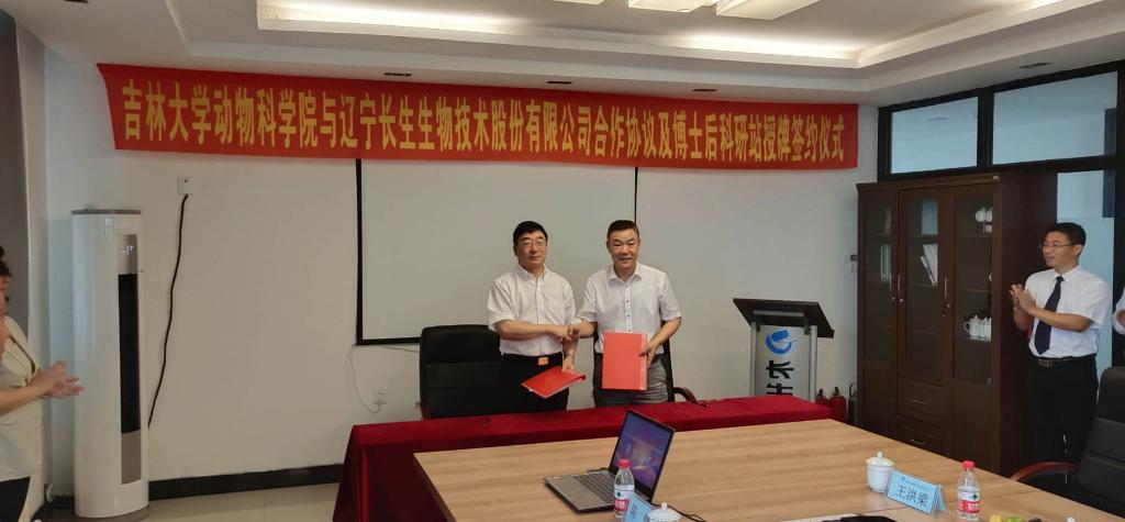 张嘉保院长代表beat365英国官网网站与辽宁长生生物技术有限公司签订了合作协议。学院孙博兴副院长与王全新董事长为“beat365英国官网网站教学实习与社会实践基地”揭牌,张明军副院长与王智琴总经理为“beat365英国官网网站博士后科研工作站”揭牌。这次活动开启了beat365英国官网网站动物生产类专业产教融合协同育人的模式,深入推进了新农科建设步伐。