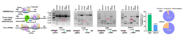 迄今,CRISPR-Cas9及Cas12系统已被广泛用于基因组编辑,但其精确缺失大片段基因组的效率较低。CRISPR Type Ⅰ型系统已经被证明在真核细胞中实现了高效率大片段基因敲除,以Type I系统中研究最为清楚的I-E亚型为例,5个不同蛋白组成的超大复合物Cascade 可识别Type I-E型的靶标DNA,而靶标DNA的切割则由具有解旋酶及核酸酶双重功能蛋白Cas3来执行。只有当CRISPR RNA和靶标DNA互补配对且最终形成R-loop时,Cas3才会特异性地募集到Cascade上并被激活酶活性,从而降解上游区域并导致不可预测的基因组大片段缺失。因此,如何精准控制Type I-E介导的DNA片段缺失,具有重要的科学及应用价值。