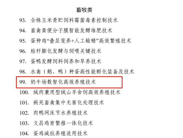 近日,农业农村部发布了2023年农业主导品种和主推技术的通知,共遴选出10项重大引领性技术、143个主导品种和176项主推技术。其中,我院动物繁殖调控团队主导完成的“奶牛场数智化高效养殖技术”成功入选主推技术。推介发布农业主导品种主推技术,旨在发挥科技对提升全国粮油等主要作物大面积单产的支撑作用,加快优质品种和先进适用技术推广应用,满足当前生产急需和未来产业发展需要。
