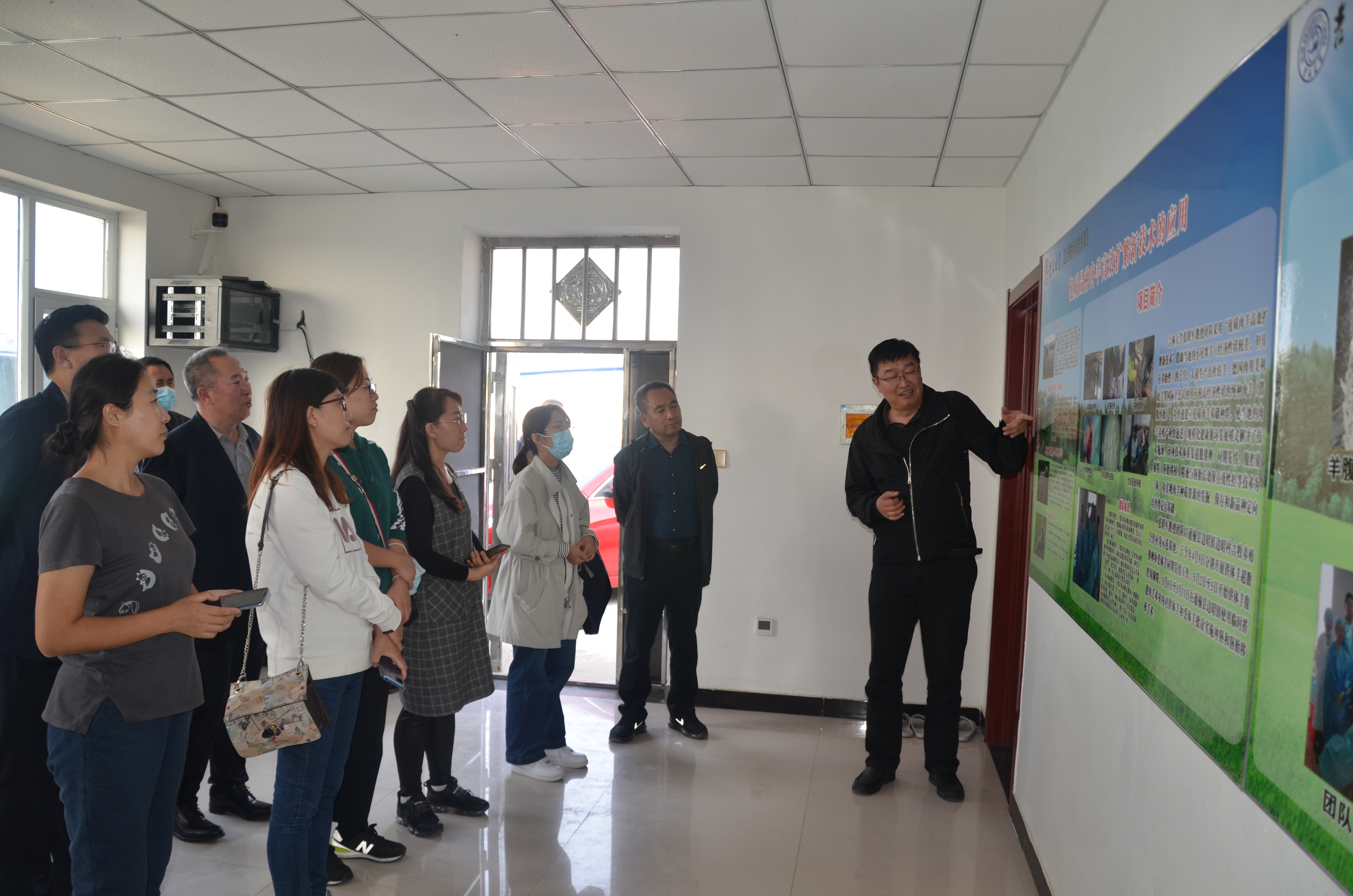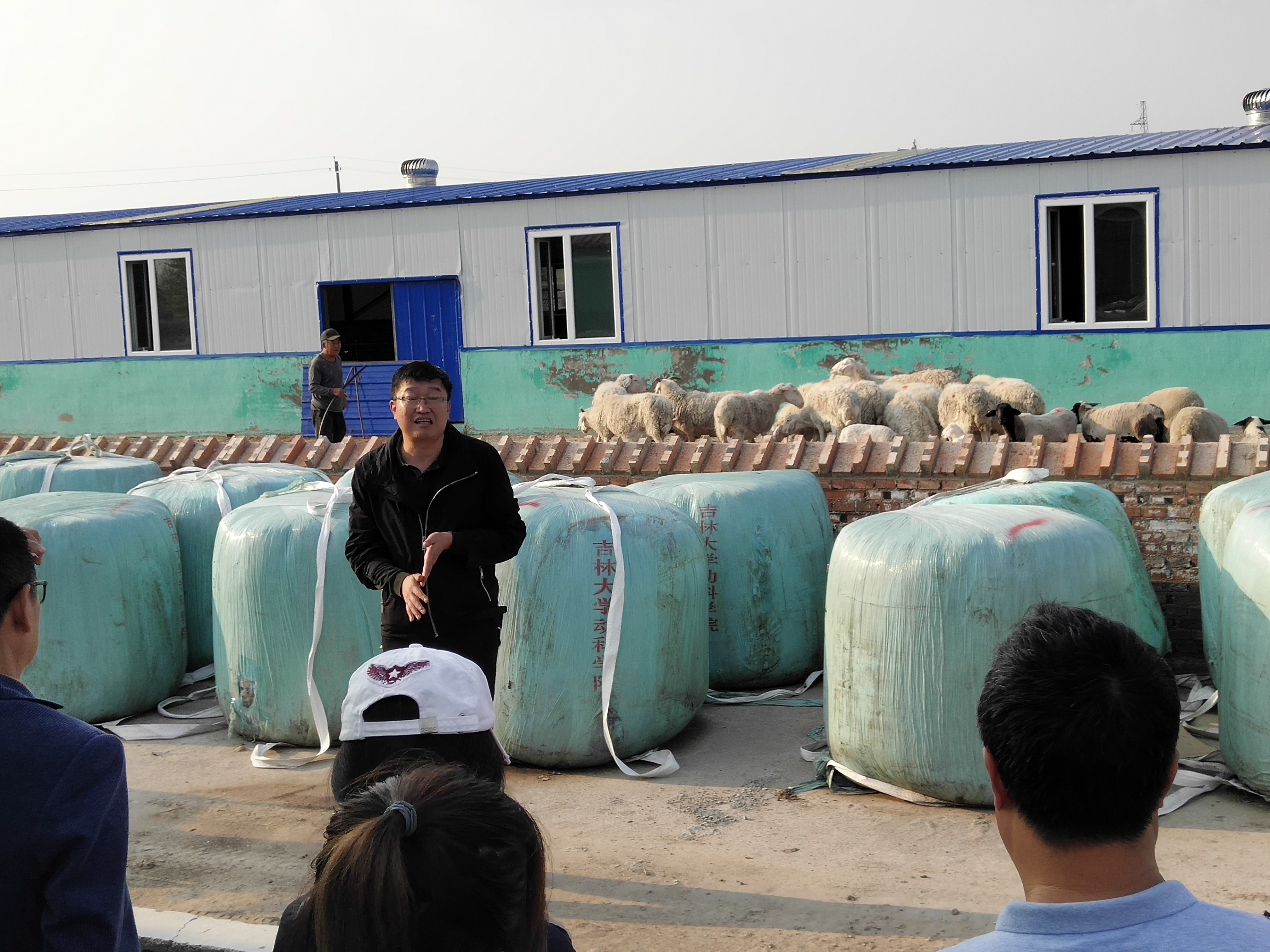 在边昭村第一书记王野和学院张明军教授的带领下,参观团队来到了“牧业小区”。张明军教授的“优质品种肉羊高效扩繁新技术”和王鹏副教授的“粗饲料发酵加工技术”在这里得到了广泛的应用,张教授借助当地多胎性好的小尾寒羊,大量生产出杜泊羊、美利奴等国际上公认的具有较高经济性状的纯种肉羊,与当地寒羊杂交,生产抗病性强、耐粗饲和肉质好的二元杂交羊,解决了当地肉羊养殖业快速规模化发展的技术瓶颈。王鹏副教授利用发酵技术将当地玉米秸秆和非粮饲料源等加工副产品转化为草食动物粗饲料,也为农户和企业带来了附加效益。