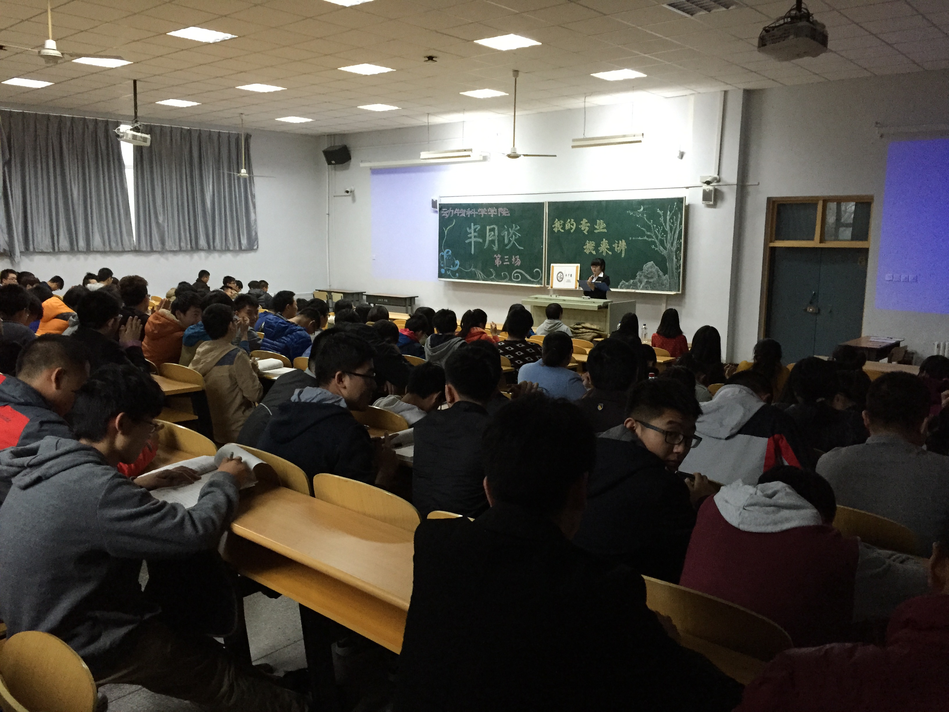 2015年4月2日,周四下午四点,beat365英国官网网站2014级全体本科生齐聚科学讲堂200教室,以热烈的掌声欢迎本期嘉宾2011生物技术(动物)专业的王一名学姐和2012级生物技术(动物)专业的吴志竞学姐参加本次分享会。