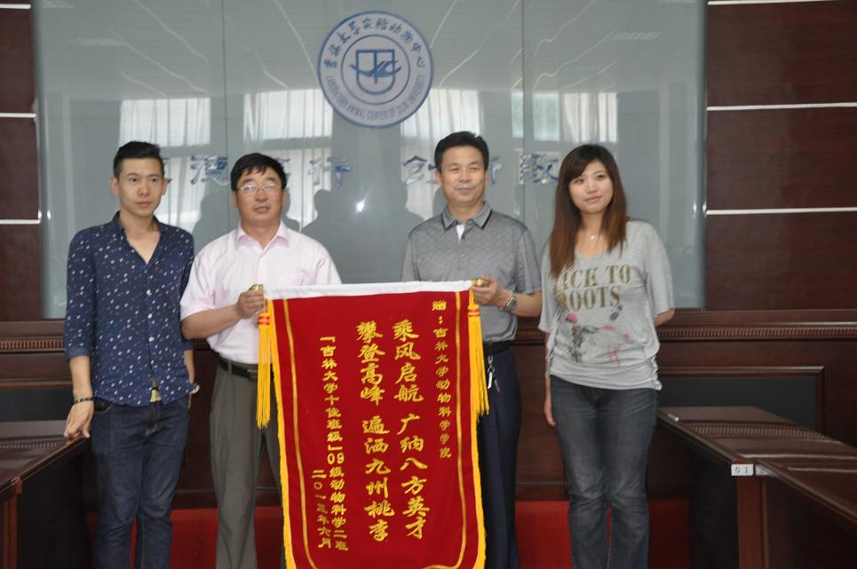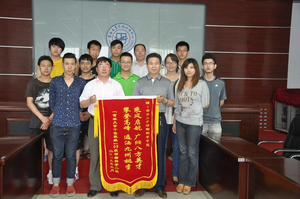 6月28日下午2:30,beat365英国官网网站2009级动物科学2班毕业生在离校之际向学院赠送了锦旗。学院院长张嘉保教授、党委书记赵光军老师、党委副书记曹伟光老师、毕业班辅导员肖建荣及部分毕业生代表参加了此次赠予仪式。