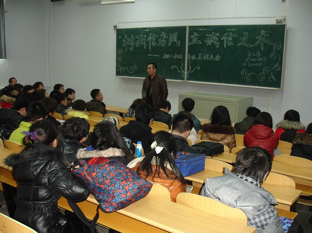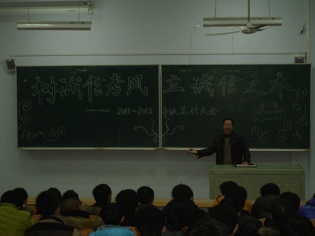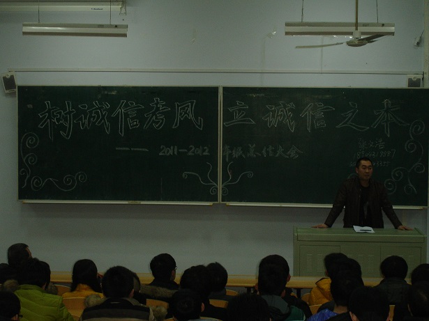 为进一步加强学风、考风建设,营造公平、公正、诚实守信的考试环境,强化学生的诚信意识,确保期末各项工作顺利进行。12月23日下午,动物科学院2011与2012级年级大会在科学讲堂100举行年级大会。会议由辅导员张文浩主持,学院党委副书记曹伟光老师参加会议并讲话。