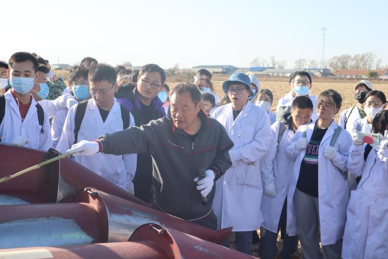活动现场,农业实验基地副主任唐心龙老师结合玉米收获为同学们讲解了玉米联合收割机的各部分构造、功能,结合五桦犁耕整地作业讲解了农业整地作业模式、要求等,并组织学生观看机械作业。