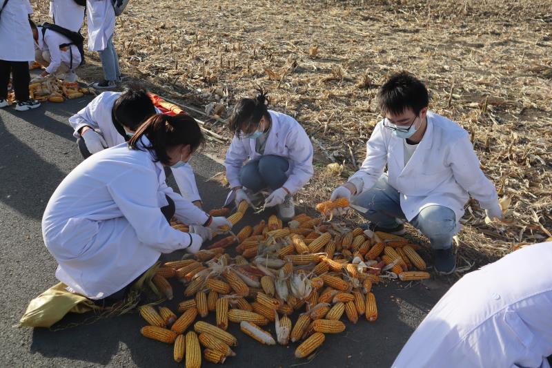 为增加秋收活动的趣味性,学院还在同学们分组的基础上,设置了田间玉米收集竞赛、识别了解中草药、胡萝卜采拔以及“玉米王中王”现场评选等四个游戏竞赛环节。在田间玉米收集竞赛环节中,同学们四人一组,分工明确,在活动开始后迅速收割田地中残留的每一根玉米。时间悄然流逝,收集结束后,各小组将劳动果实转移到集中处理点,认真清点玉米数目,并甄选出大且饱满的“玉米王中王”候选者。装袋整理完玉米后,全体成员一同前往基地中草药园交互式作物课堂。经过农业实验基地副主任郝宏智老师介绍以及“识花君”APP的辅助,学生了解到枸杞、刺五加等多种中草药的生命周期和生活习性。在满足浓厚求知欲的同时,同学们在郝宏智老师指导下亲自动手、实际操作,采摘下一个个形态大小风格迥异的萝卜。活动最后,进行“玉米王中王”和获奖团队的考核评比。评委按照各小组收集玉米数量颁发团体一、二、三等奖,同时以玉米的尺寸和色泽作为主要参考依据,逐一对各支队伍的参选“玉米王中王”称号的玉米进行细致鉴别,最终决定将“玉米王中王”奖项颁发给“下岗工人再就业”团队。