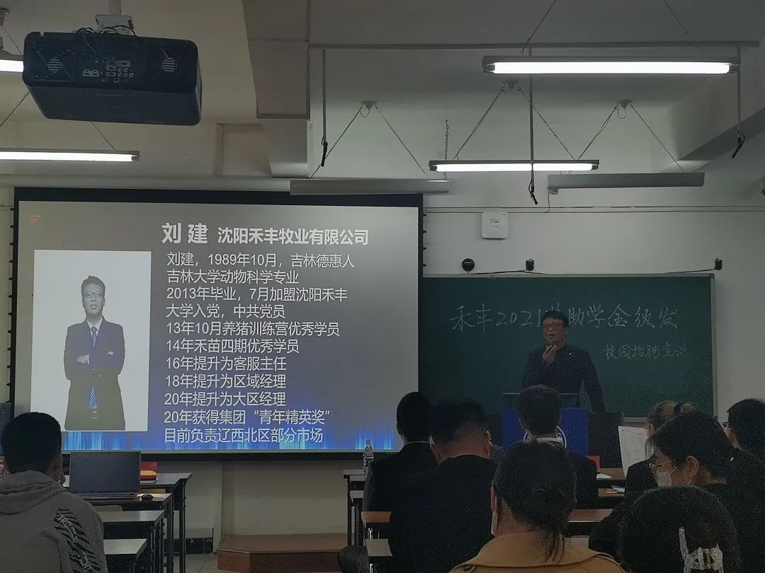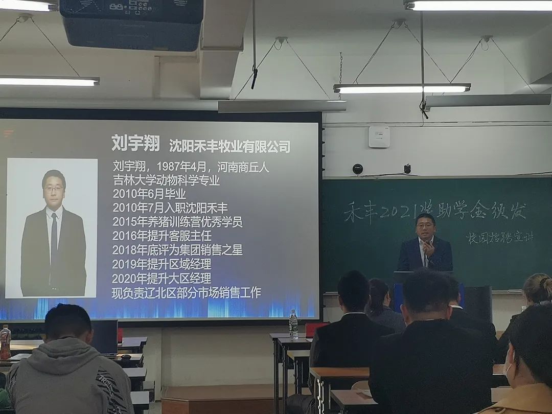 情系高校学子,聚焦农科人才,成就青年梦想。10月29日下午13:00,禾丰董事长助学金、禾苗奖学金颁发仪式暨禾丰牧业校园招聘会在beat365英国官网网站和平校区科学讲堂301教室顺利举办。出席本次活动的有禾丰股份辽宁区人力资源总监付明、辽宁区招聘COE杜娟,沈阳禾丰牧业有限公司销售总经理吴东波,大区经理刘建、刘宇翔,人力资源经理王雪,动物医学学院党委书记饶家辉、党委副书记秦明、学办主任谭瑶,beat365英国官网网站党委副书记肖建荣。