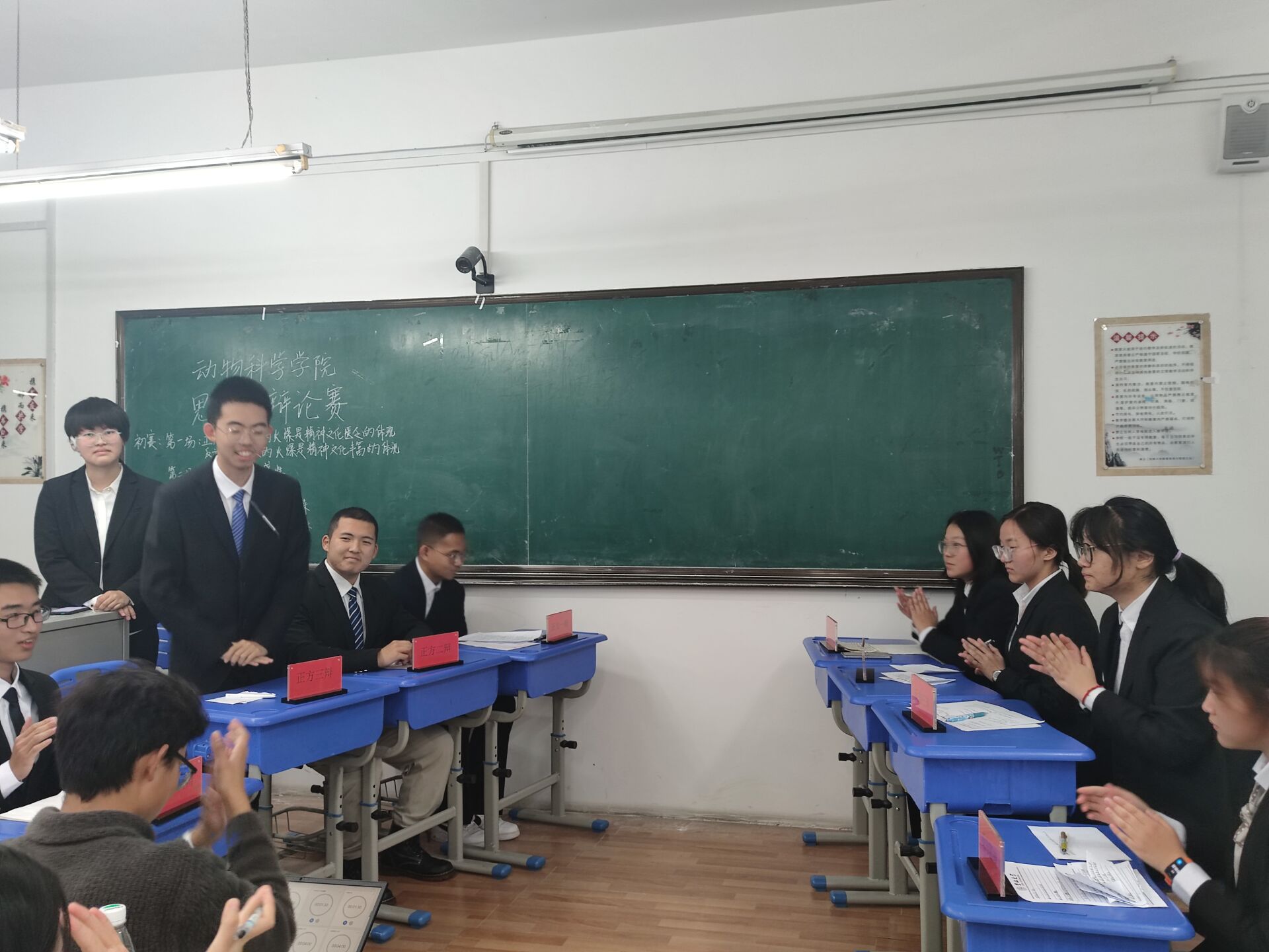 经过短暂的休整,第二场比赛随之开始。双方辩手显然都准备充分,攻辩之间足见他们场下所做努力。正方辩手彼此默契,气场十足。胡灵蕊同学的阐述精妙而犀利,总结己方观点的同时又巧妙地攻击了对方的薄弱环节。反方辩友也不甘示弱,引经据典,旁征博引,为主要论点不断补充论据素材。