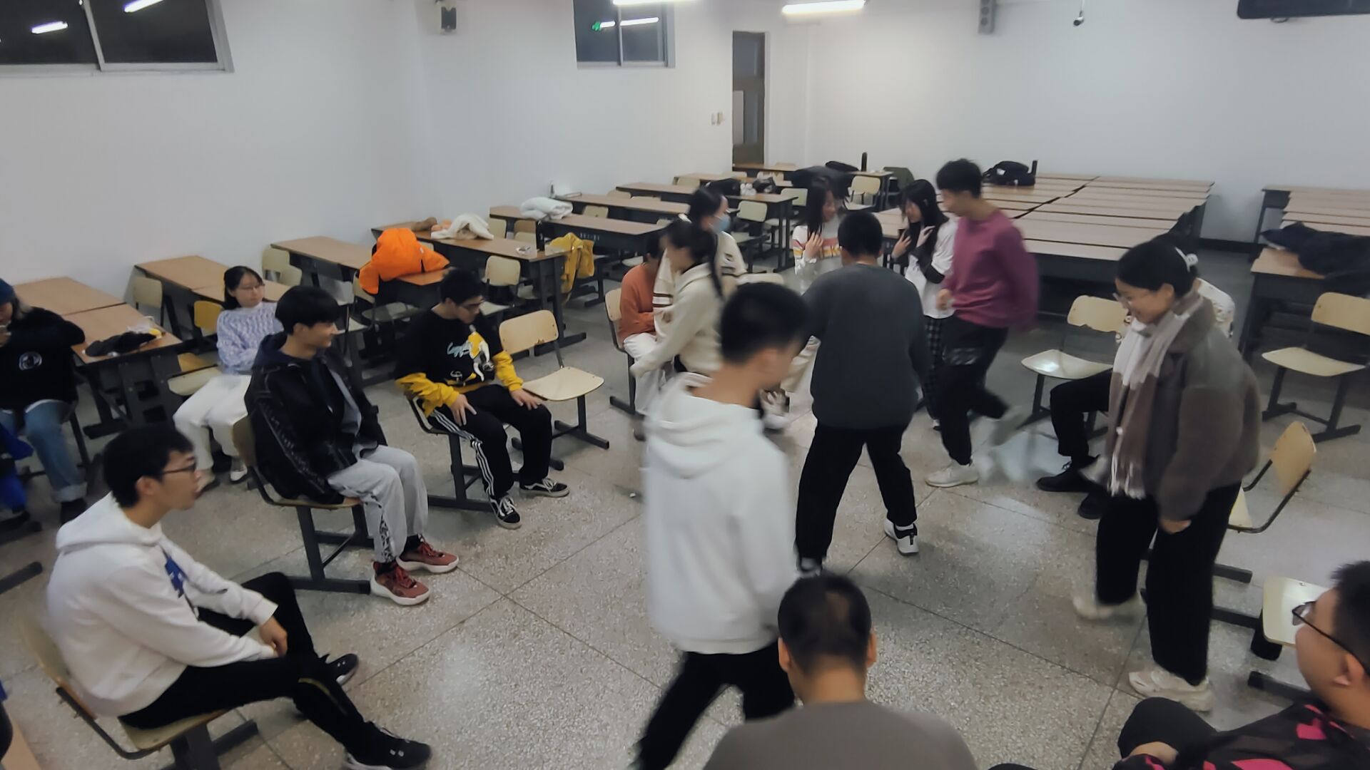 活动开始的第一个项目是“大风吹”。全体成员围成一个圆圈。开心使者站在圆圈中间,负责发出指令,同学们按照指令移动。目的在于锻炼同学们的反应能力,帮助大家放松心情,轻松进行接下来的游戏环节。