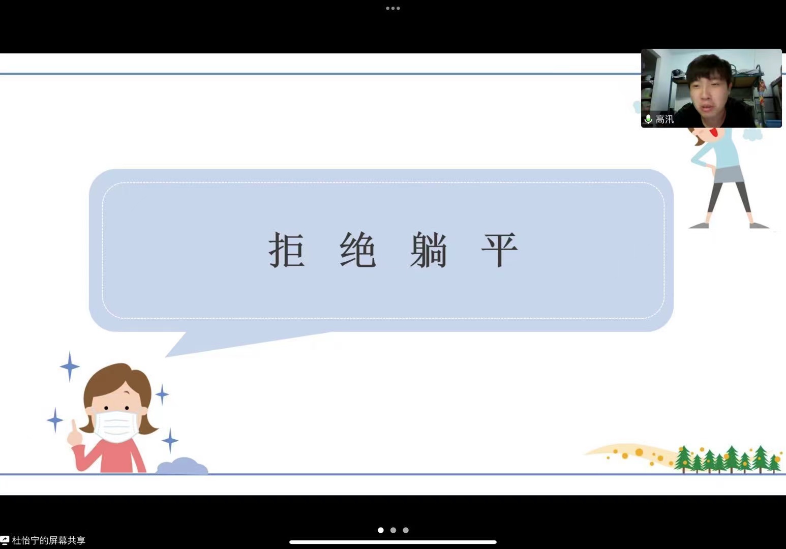 会议伊始,高汛同学梳理了自封闭管理以来同学们的心路历程变化。全体师生观看《身边人》战“疫”故事短片,片中展现了当代大学生在疫情封校期间所展现出的积极精神风貌。同学们也集中提出了有关于当前面临的问题,主要集中在毕业设计、考研复试、考研调剂、求职就业等方面,与会老师耐心细致地解答了同学们提出的问题,帮助大家正确分析认识当前形势,适时调整个人心态和学业规划。会议最后,肖建荣老师询问了2018在校外实习的2018级学生的目前的学习生活情况,她强调:在校外实习的同学们一定要做好个人防护,按时在网络办事大厅签到打卡,与学校老师保持联系。