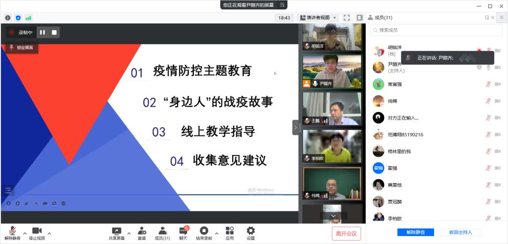 会议伊始,院长孙博兴老师对疫情发生以来同学们的学习生活情况进行了解,讲述自己在隔离期间读书工作的例子来教导大家在封寝时期要调整好自己的状态,多与老师交流,积极学习、充实自己、珍惜光阴,努力准备考研、考公、就业等。随后,由尹暄齐老师组织全班同学共同学习疫情防控基本知识和政策并观看观看短视频《身边人》战“疫”故事,引导全体学生践行社会责任,共同抗击疫情。志愿者胡铭洋、贾冠麟等同学讲述了自己的相关志愿服务故事,王子娇、张一凡等同学分享了自己的学习经验。紧接着,王鹏老师对同学们开展线上学习指导,他表示,由于现在网络资源鱼龙混杂,给我们的生活学习带来便利的同时也伴随着许多的诱惑冲击,因此,希望同学们再次明确理想目标制定一份适合自己的详细封闭管理期间学习计划。会议最后,李纯锦老师对此次班会进行总结:希望同学能够在疫情防控的特殊时期遵守校园属地的管理要求,保证好良好的作息,多与老师、家长、同学加强沟通交流,在寝室里调整好心理状态,积极地面对线上学习以及封寝生活,展示青年独有的青春风采。