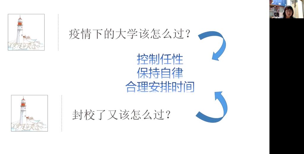 随后,丁瑜老师邀请刘鑫苗学姐进行线上学习指导,现身说法,传授疫情之下如何适应教学习方式的转变,合理安排大二期间的学习生活。刘鑫苗希望学弟学妹们在特殊时期要保持自律,以学习为重,同时培养自己的兴趣爱好。