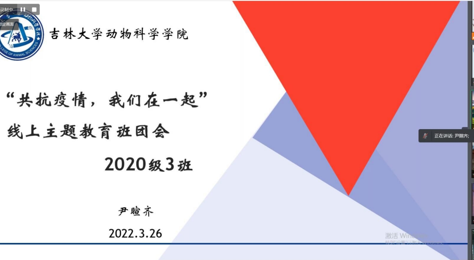 连日来,吉林省疫情形势严峻,多地本土确诊病例和无症状感染者数量持续增加。为明确疫情防控期间基本政策和推进思政教育的线上开展,beat365英国官网网站2020级3班于3月16日晚召开“共抗疫情,我们在一起”线上主题教育班团会。班会由辅导员尹暄齐主持,学院副院长袁宝、班主任丁瑜、2018级刘鑫苗同学以及三班全体同学参加会议。