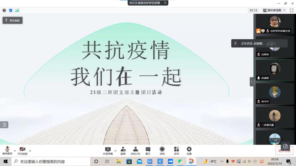 为落实学校疫情防控封闭管理期间各项工作的要求,凝聚班级同学抗疫力量,传播科学抗疫知识,beat365英国官网网站2021级2班于3月18日召开了“共抗疫情,我们在一起”线上主题教育班团会。辅导员王可佳老师,班级全体同学参加班会。