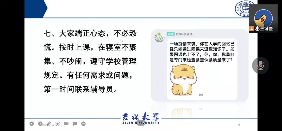 同学们暖心回应:“老师们请放心,我们将严格遵守学校规定,合理规划本学期学习生活,认真完成线上课程,做自己生命健康的第一责任人,守护我们的吉大校园,更守护我们的家。”与会老师叮嘱同学们坚决要做到三个“要”:一是要相信,相信国家、相信学校;二是要重视,重视疫情、重视防控;三是要适应,适应教学方式、适应封校生活。
