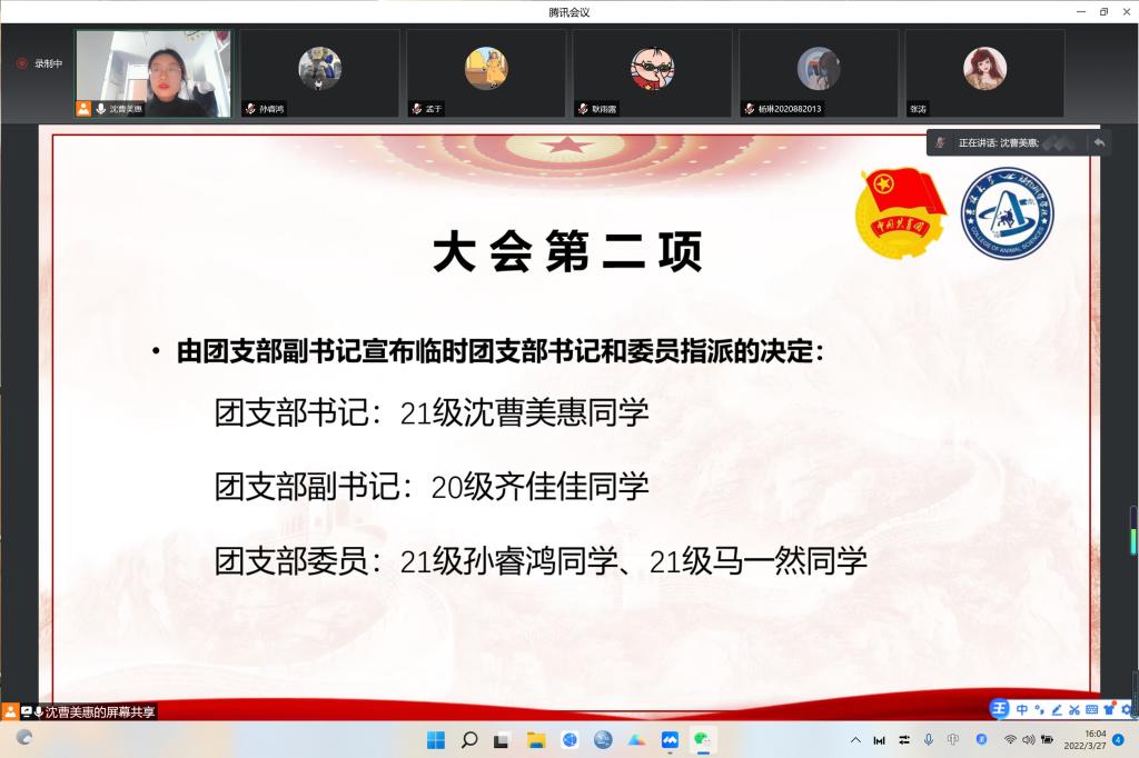 大会第一项,由团支委成员孙睿鸿宣读团支部成立背景及工作任务。为切实发挥共青团组织在防疫控疫工作中的战斗堡垒作用及团员的先锋模范作用,强化团的基层建设,突出特殊时期团支部的组织凝聚力,面向疫情防控时期在临时工作岗位的共青团员建立临时团支部。临时团支部任务主要包括:组织凝聚、沟通信息,互相帮助、解决困难,开展活动、疏导情绪。