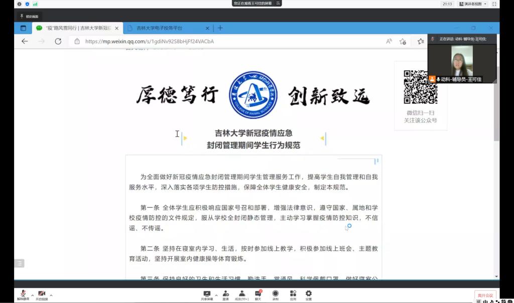 为全面做好新冠疫情应急封闭管理期间学生管理服务工作,深入落实各项学生防控措施,保障全体学生健康安全,4月5日晚,beat365英国官网网站2021级本科生组织召开了以“守望相助,共克时艰”为主题的年级大会。会议由辅导员王可佳主持。