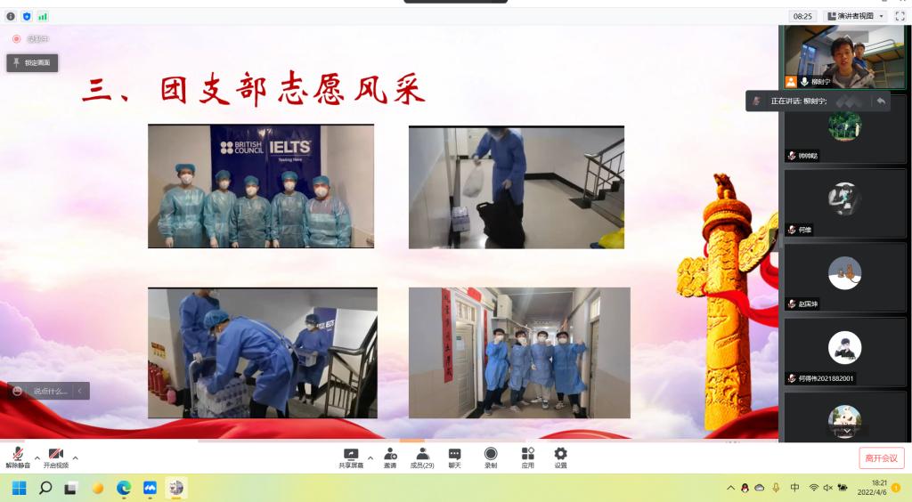 随后,团支部书记柳刻宁围绕总书记的抗疫指示、学校疫情防控指示、团支部志愿风采、坚持就是胜利等四个方面进行讲解。