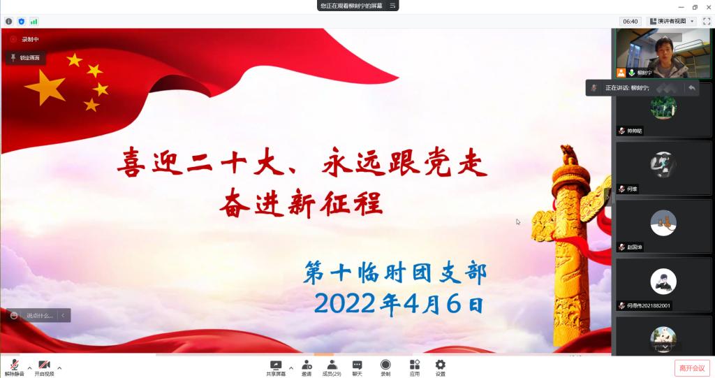 为学习贯彻习近平总书记关于疫情防控工作的重要指示精神、认真学习各级党委和政府的疫情防控工作部署,教育广大团员青年遵守疫情防控要求,执行学校、学院疫情防控工作各项规定,保证每日作息健康规律,保证充足学习时间。beat365英国官网网站第十临时团支部于4月6日晚6时召开“喜迎二十大,永远跟党走,奋进新征程”为主题的团日活动。此次会议采取线上腾讯会议的形式举行,第十临时团支部全体团员参与了此次活动。会议由团支部副书记任中帅主持。