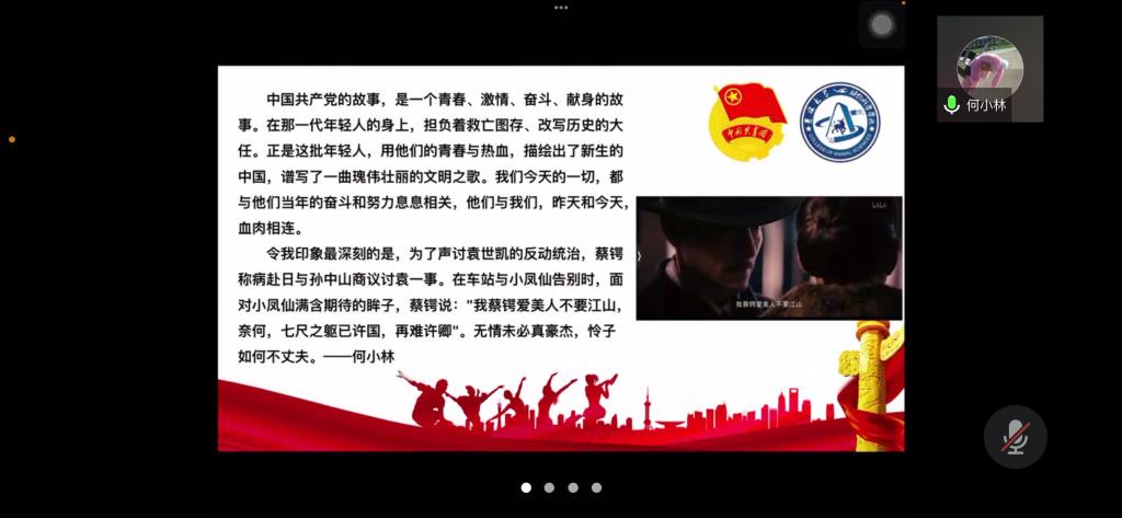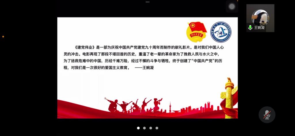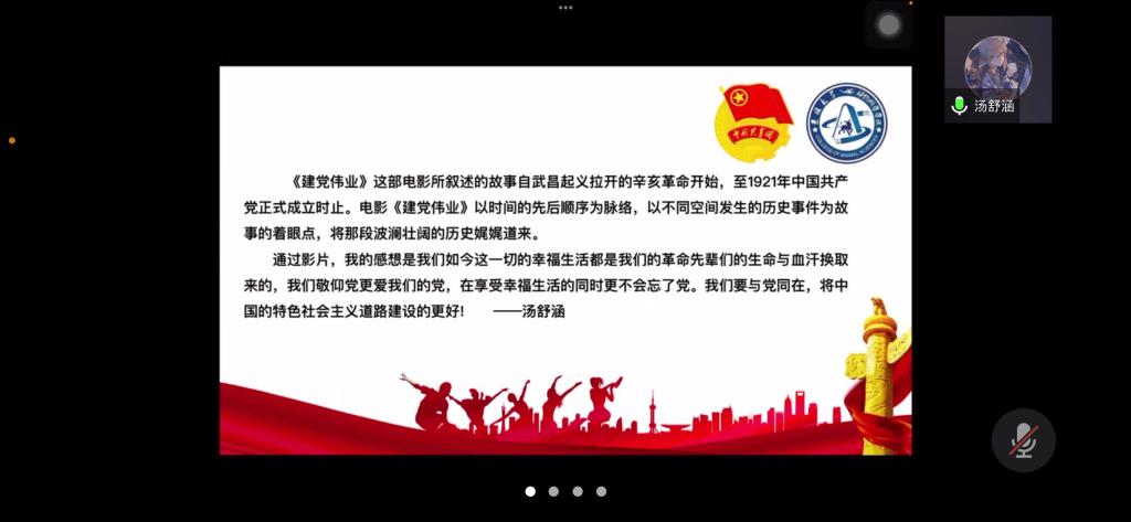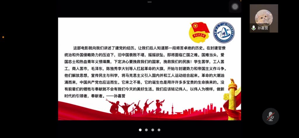 为弘扬爱国主义精神,丰富封校隔离期间学生的生活,加强学生团员的思想教育,使同学们正确认识祖国的历史和现实,增强爱国感情和振兴祖国的责任感,beat365英国官网网站第七临时团支部举办了爱国主义电影《建党伟业》观影活动,并于2022年4月3日下午14时依托腾讯会议召开“《建党伟业》观后感”线上分享会。活动由临时团支部书记苏廖枷域主持,支部全体成员参加。