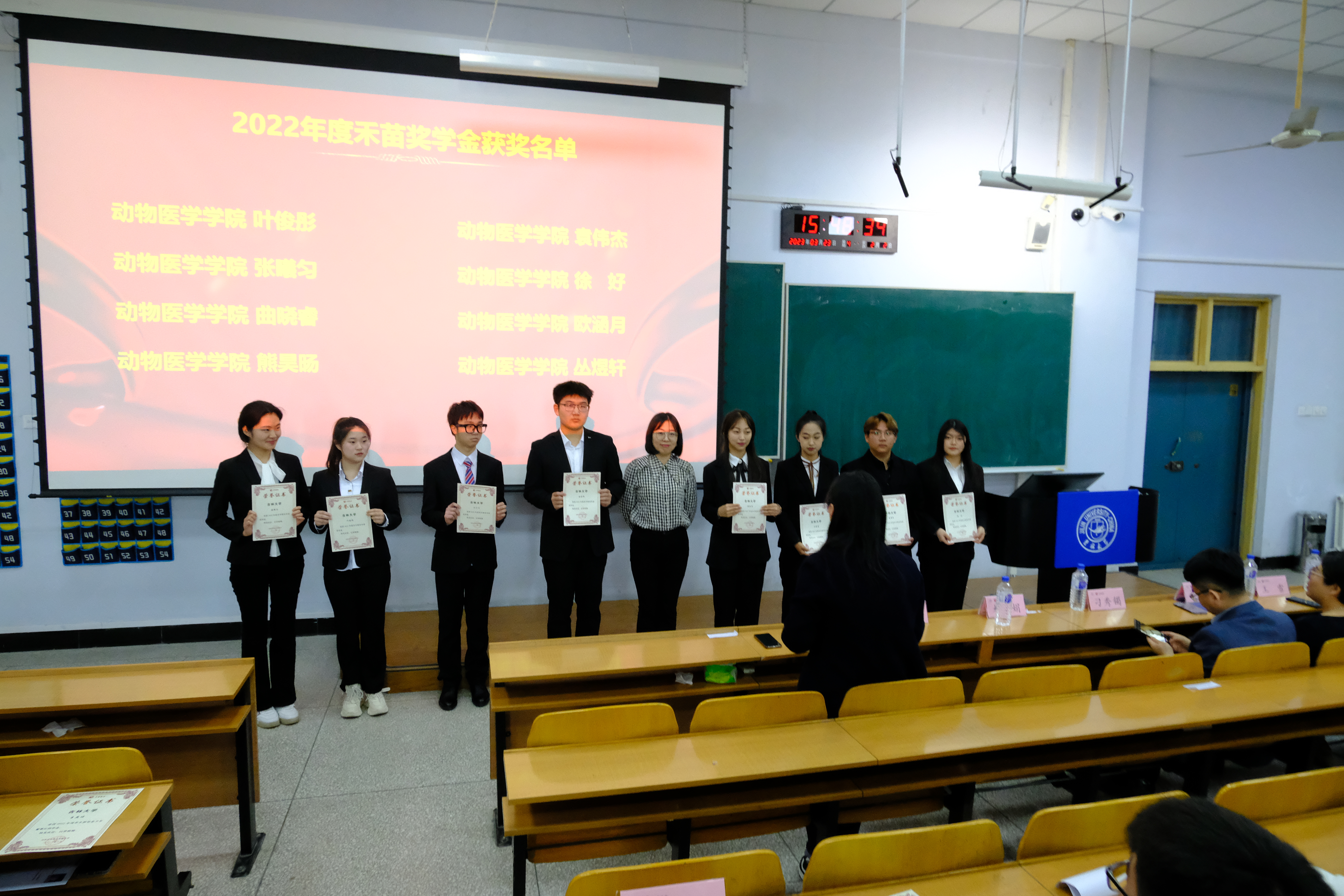 首先,肖建荣老师为本次活动致辞。肖老师对禾丰集团捐助“金卫东董事长助学金”“禾苗奖学金”,多年来心系高校师生,助力农科人才成长表示感谢,对禾丰集团蒸蒸日上来发展表示祝贺。随后,谭瑶老师宣读获奖名单,并向同学们表示祝贺。刁经理、王经理、杜经理依次为获奖同学颁奖并合影留念。 颁奖仪式结束后,杜经理为我们开展校园招聘宣讲,详细地向同学们介绍了禾丰牧业的集团文化、发展历史和未来规划等情况,重点介绍了集团的当前发展目标和人才培养计划。