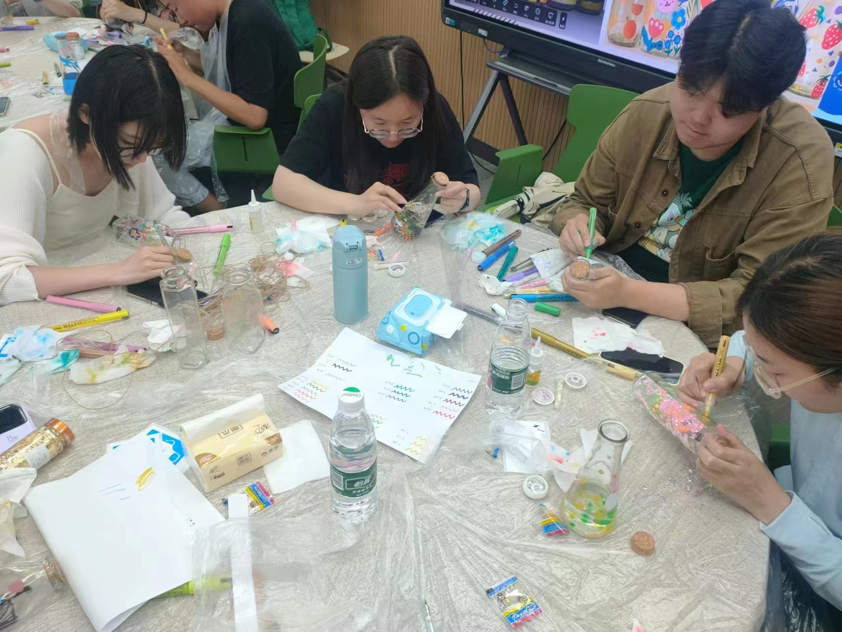 正值期末考试周,同学们难免因备考产生的压力和焦虑。“绘心玻璃瓶”能为同学们创造一个能够提供心理支持和艺术滋养的空间,帮助同学们勇敢地进行自我探索,促进心理健康和个人成长。 在本次活动中,同学们能够借助玻璃瓶去勇敢地表达自己的情感,释放内心的压力,参与的同学彼此之间也通过体验、交流和互动,实现了向内探索、向外支持和相互支持等。