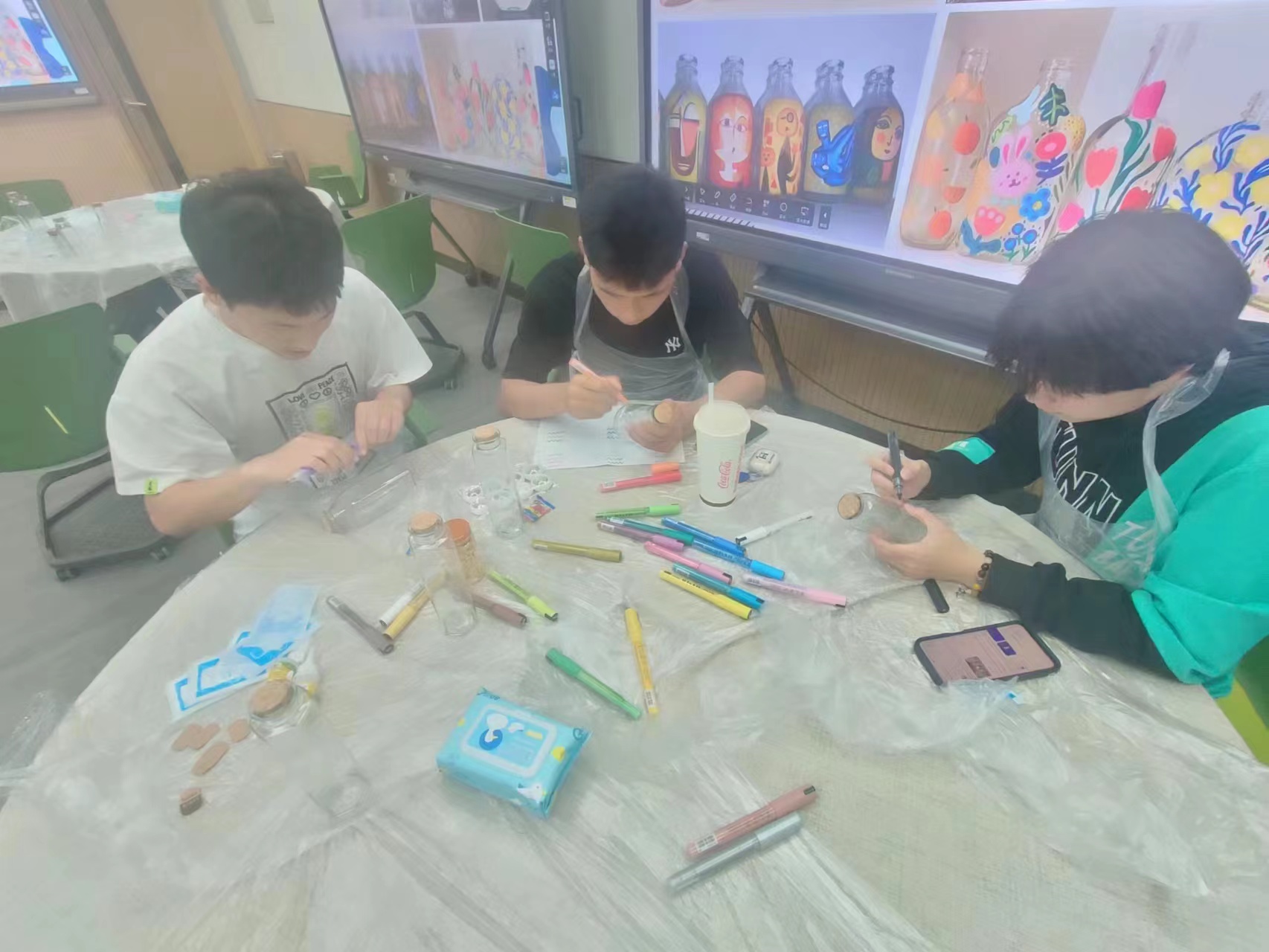 五彩颜料填涂一个个天马行空的创意,一双双巧手绘出内心深处的悲伤与渴望。绘画过程中同学们相互交流,欣赏彼此的画作,彼此真诚赞美,气氛其乐融融。同学们感受到彼此的相同之处,又从其他同学的画作中窥见各自的特别之处。活动最后,同学们相互分享了自己的感悟,为此次活动画上了一个完美的句号。最后,同学们带着自己的玻璃瓶绘画作品合影留念。