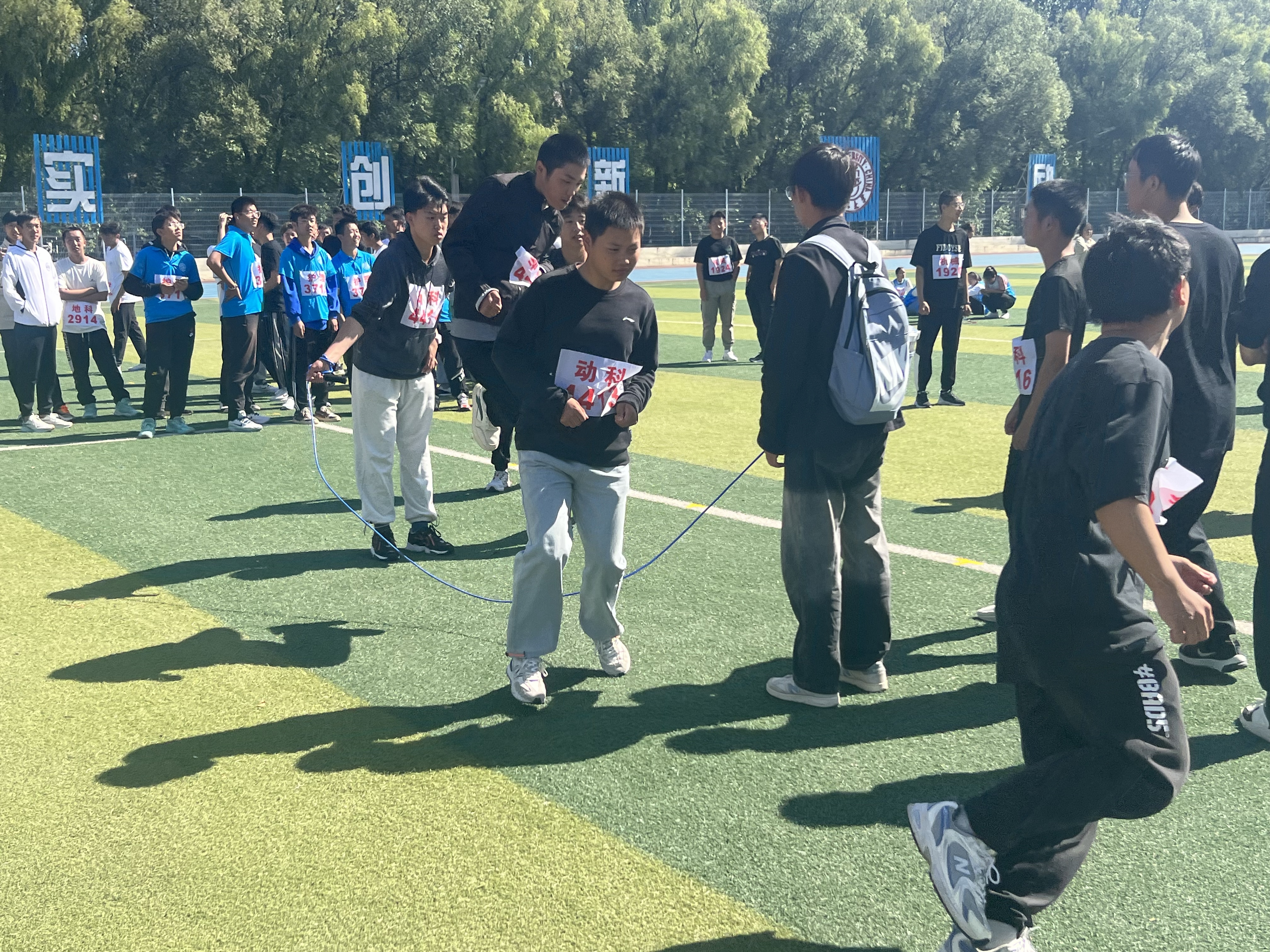 时代列车是一项趣味项目,同学们用手臂连接成一个整体共同向前奔跑。同学们迈着整齐划一的步伐,在一二一的口号中阔步向前。绿茵场上,动科运动员们团结一心的精神为我们留下了深刻的印象。