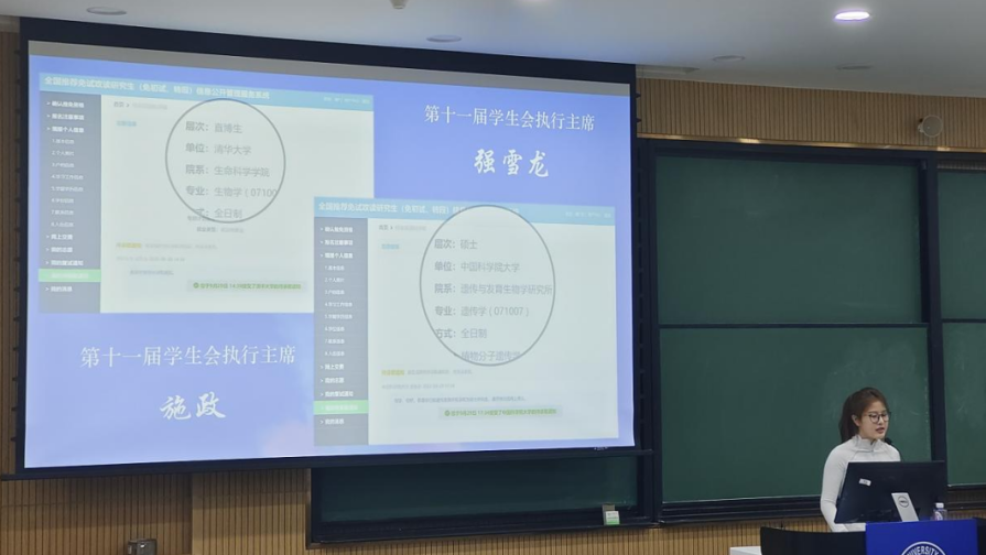在学生会宣讲环节,执行主席赵佳明、唐奕菲先后发言,他们分别从学习成绩、社会实践、参与活动等方面进行了自我介绍,用自己充实的两年大学生活生动地回答了“参加学生活动与学习是否冲突”这一新生普遍关心的问题。