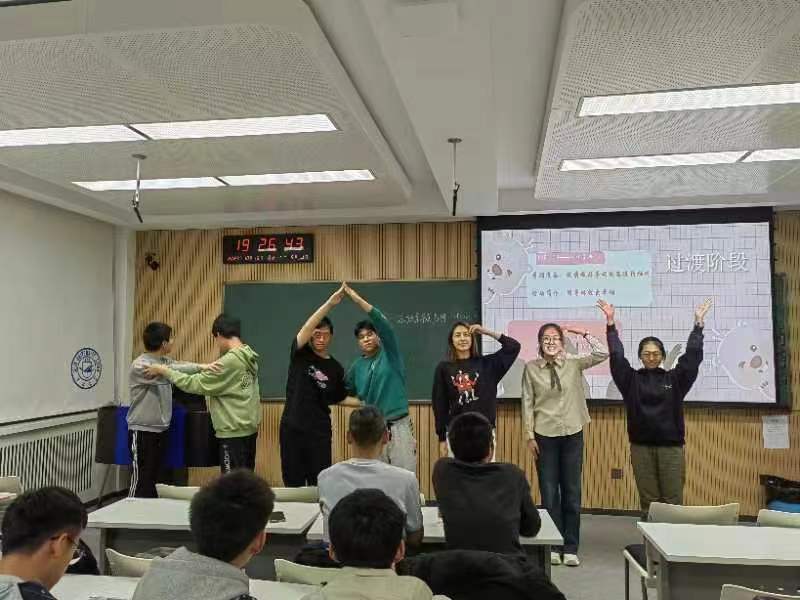 班会之初,我院四名心理委员以主持人的身份登场,随着给自己鼓掌一分钟活动的结束,心理班会正式拉开了帷幕。为什么同学在报纸边缘苦苦挣扎,不愿踏出这窄窄的方寸一步?原来是“集体登陆”的景象。又是谁坐在地上,对凳子上的同学哈哈大笑?是在“抢椅子”中落败的玩家。为什么沉默寡言的同学正在大家的夸赞声中满面羞涩?是“我知道”的魔力。在心理委员的主持与心理部学长学姐的指导下,班会的每一个环节都充满了欢声笑语,每一个游戏都让人受益匪浅。一阵阵鼓掌,一片片欢声,一张张笑颜,班会气氛被不断推上新的高潮。最后,在温暖的《相亲相爱一家人》大合唱中,陌生的坚冰消融在温暖的目光里,刻板的偏见融化在紧搂的臂膀中。在所有人共同的创作下,象征着全班、全院的团体树茁壮成长,每一颗心都有自己的位置,每一个名字都扎根在同窗心中,多少美好的感情在树上结出果实,多少纯洁的心灵在纸上枝繁叶茂!