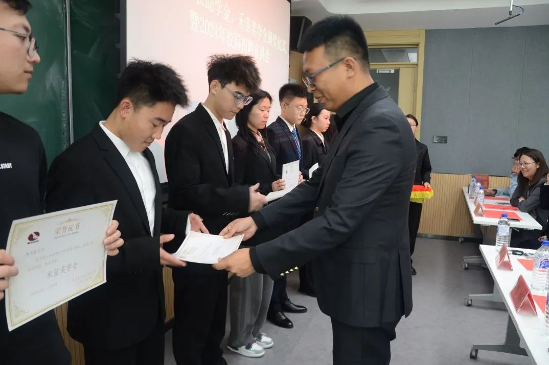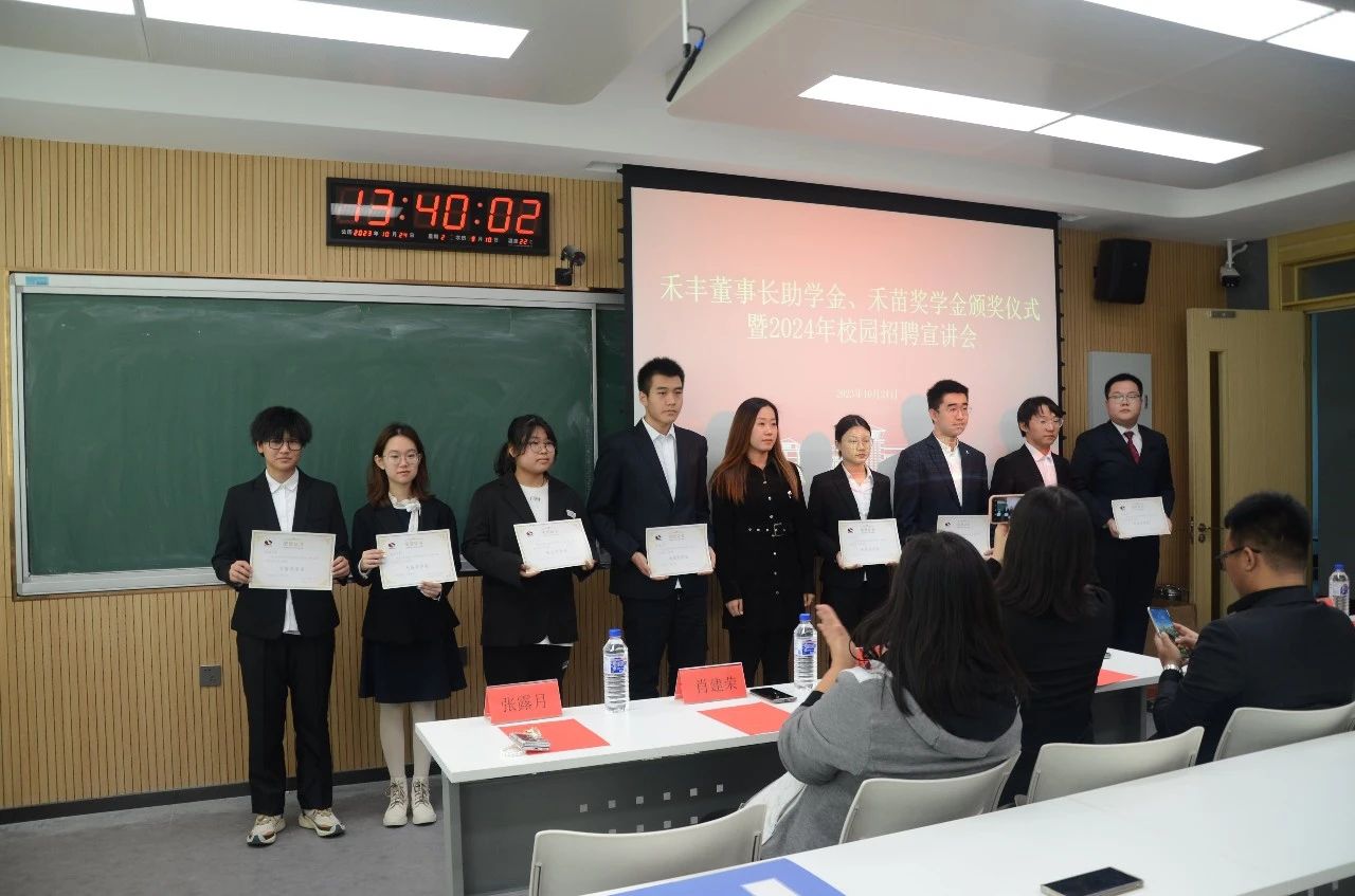 随后,李娜、王可佳分别宣读禾丰董事长助学金获奖名单和禾苗奖学金获奖名单,杜娟、刘建分别为获奖同学颁发证书,合影留念。
