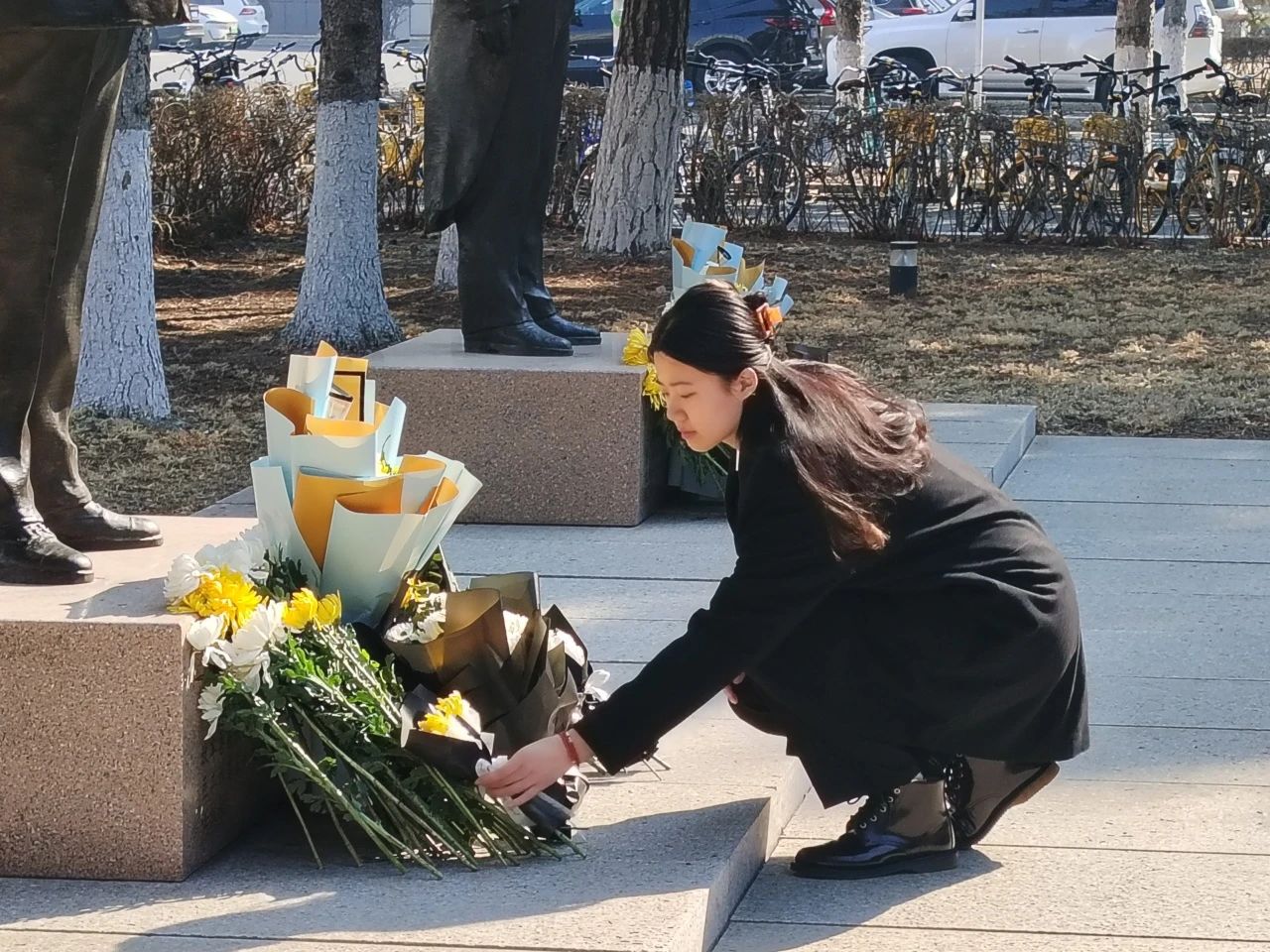 讲述结束后,学生代表缓步上前,仔细擦拭三位先贤的铜像。随后,贾子一老师带领全体成员列队肃立,依次敬献白菊并默哀一分钟。春风拂过,白菊轻颤,铜像熠熠生辉,无声的仪式中凝聚着对先贤的无限敬仰。