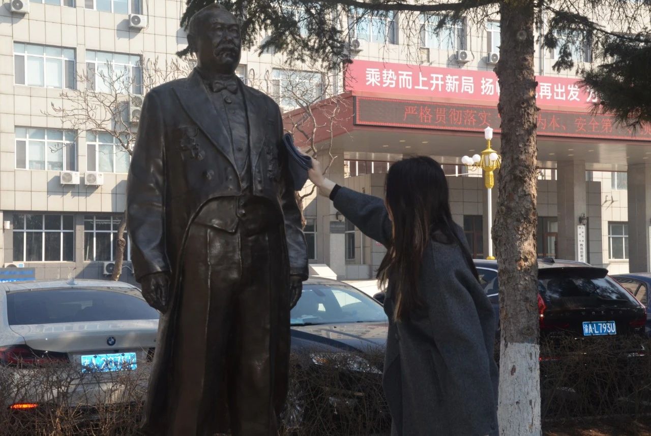 擦拭铜像寄追思,白菊静默表敬意。
