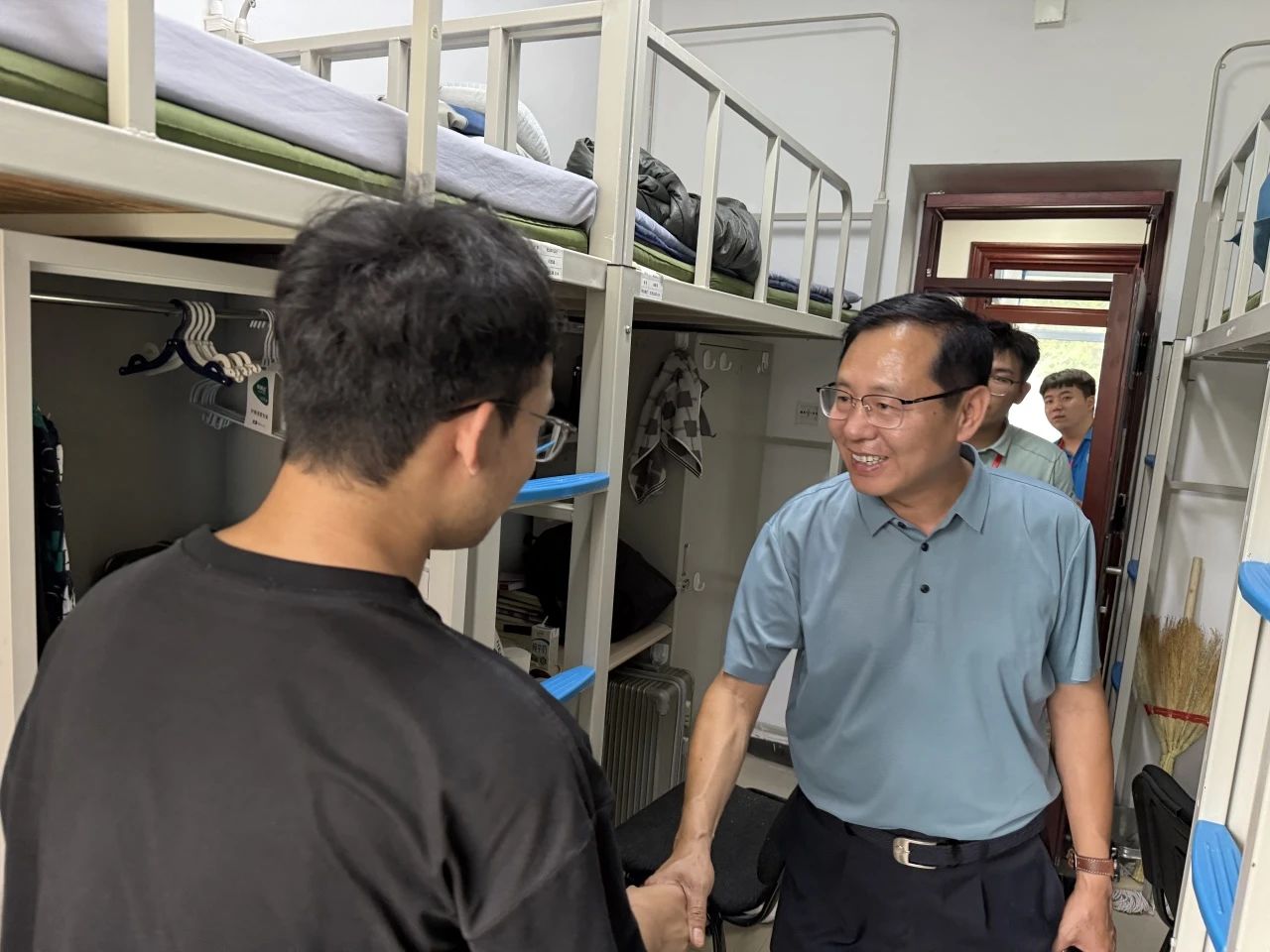 金秋送爽,扬帆起航。为深入了解2025级新生入学后的住宿状况与思想动态,打通思政育人的最后“一公里”,beat365英国官网网站党委书记徐仁元、副书记肖建荣、学生辅导员尹暄齐、贾子一等一行深入每一间学生寝室,向新生们传达学院的关怀与温暖。