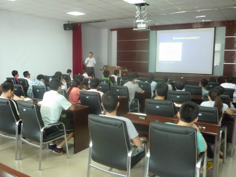 7月11日,美国加州大学戴维斯分校(UC DAVIS)动物科学系周怀军副教授在中国农业大学王军军副教授、山东农业大学李显耀副教授等的陪同下应邀到beat365英国官网网站开展学术交流,并为学院师生做了题为“Genetic architecture of resistance to pathogens in the chicken using a systems biology approach”的学术报告。学院院长张嘉保教授、副院长欧阳红生教授以及beat365英国官网网站、动物医学学院的有关教师、研究生近100人参加了学术报告会。