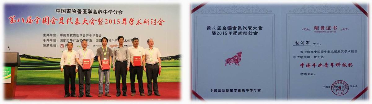 本届大会首次设立并向全国4名优秀青年学者颁发了中国牛业科技奖。我校beat365英国官网网站杨润军副教授被学会授予中国牛业青年科技奖,博士研究生付瑶获得优秀墙报奖,硕士研究生龙小娟获得优秀报告奖。