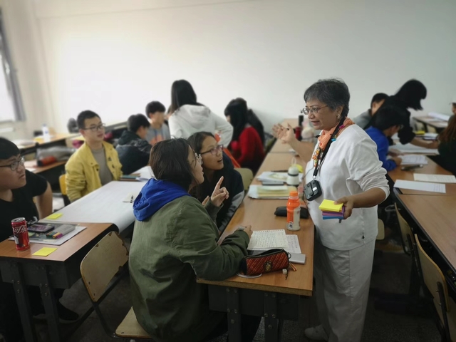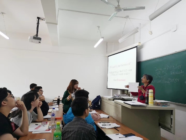 由于大多数同学是第一次经历外教授课,所以不免有一丝紧张和害羞,善解人意的Rita Basuray博士循序渐进引导大家,班主任陈璐老师也不断帮助大家理解课程。本门课程安排非常紧凑,每天都有课堂任务与课后任务,推动同学们努力提升。详细的共14页的教学大纲更是凝结了Rita Basuray博士与陈璐副教授长达半年的反复沟通与不断修改的心血。虽然这门课程节奏很快,但是同学们都觉得很开心很有意义,课程通过小组合作、生成海报和演讲等有趣的活动,使大家深入了解了自己以前知识能力的不足,在写作的技巧上也有了进一步的提高。课间同学们纷纷提出了各种各样的问题,老师也都详细地一一解答,期间不乏有一些口语流利的高手与Rita Basuray博士相谈甚欢。