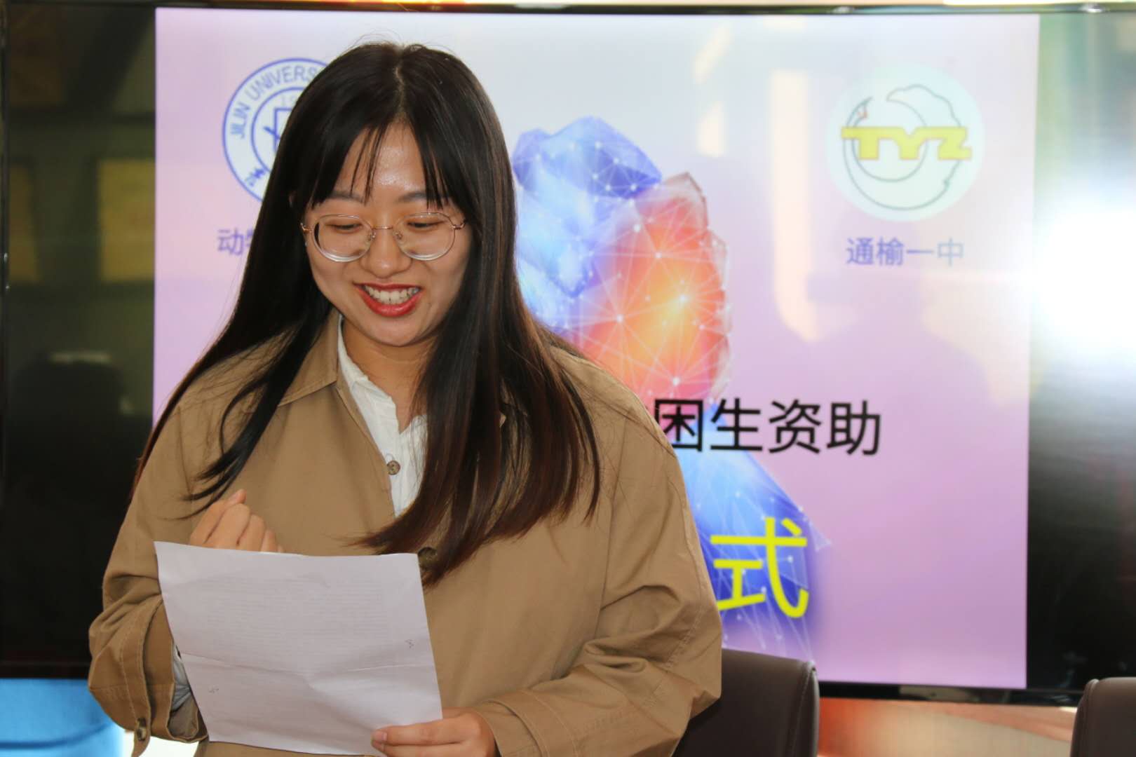受助学生代表孟庆鑫同学和通榆一中校友、beat365英国官网网站2019级本硕博连读学生杨琳分别发言。孟庆鑫同学用真诚、质朴的语言倾诉了孩子们心中的无限感恩之情,表达了他们奋发向上、报效祖国的强烈心声。杨琳作为学姐向学弟学妹寄语,她通过自己的求学经历,现身说法,鼓励他们在未来的求学和生活之路上,正视贫困,珍惜大好时光,把学习作为首要任务,把追求人生理想与服务祖国、建设家乡紧密结合起来,绘就美好人生。