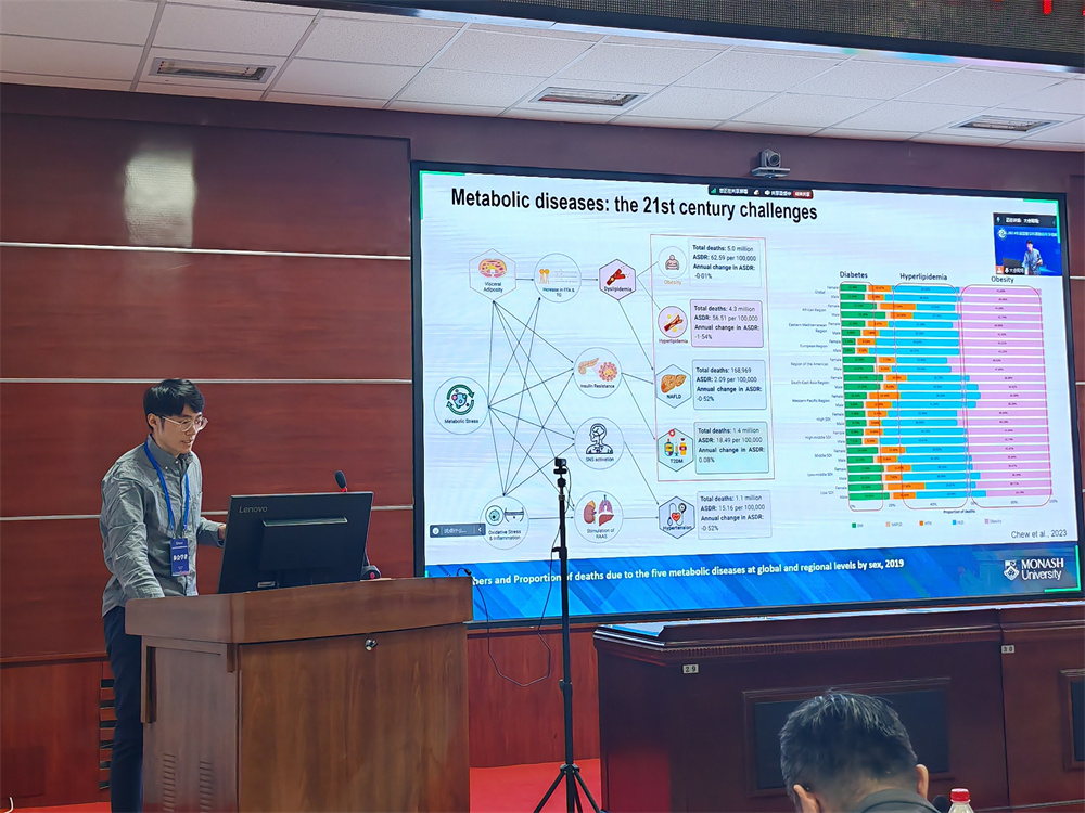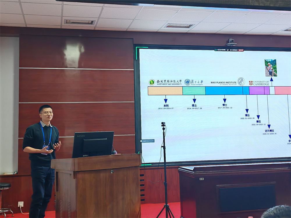 随后,6位青年学者依次作专题报告。来自澳大利亚莫纳什大学的武玉钦博士以《胰高血糖素的代谢调控作用》为题,介绍了胰高血糖素新靶点SEC22B及其在胰高血糖素调控过程中的关键作用。日本德岛大学的林青怡博士以《基于新型转染方法的猪胚胎基因编辑技术开发》为题,分享了转染技术可以实现对猪胚胎进行基因编辑。在《亲缘关系动态及其社会生活史的进化意义》中,英国剑桥大学的何鹏博士以虎鲸和人类为对象,介绍了个体间亲缘关系如何改变社会结构,进而影响地区生态。加拿大戴尔豪斯大学的胡国煜博士、比利时列日大学的陈焱森博士、英国苏格兰农业大学的李冰洁博士分别以《美国水貂抗阿留申病能力的基因组分析》、《高氮利用效率和低碳排放奶牛的遗传育种》和《英国动物遗传育种的研究和应用(2024)》为题,对美国水貂和奶牛复杂性状的解析,关键位点的挖掘和产业化应用进行了介绍。交流期间,学院师生积极提问,青年学者逐一进行回答。
