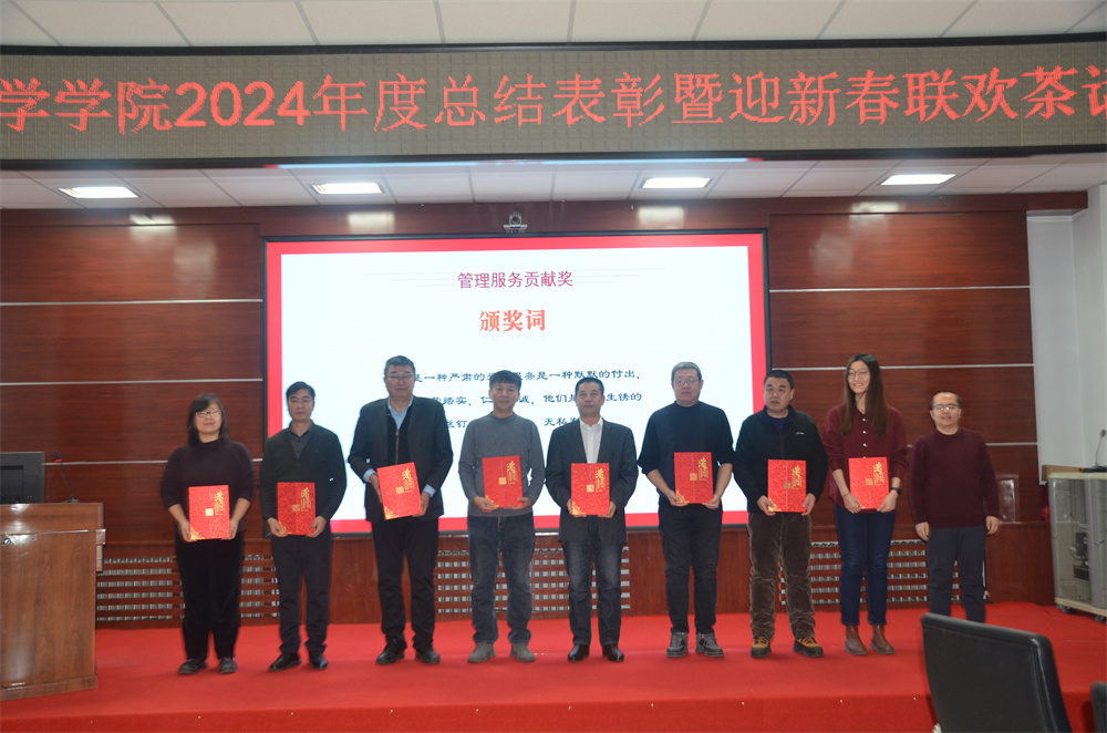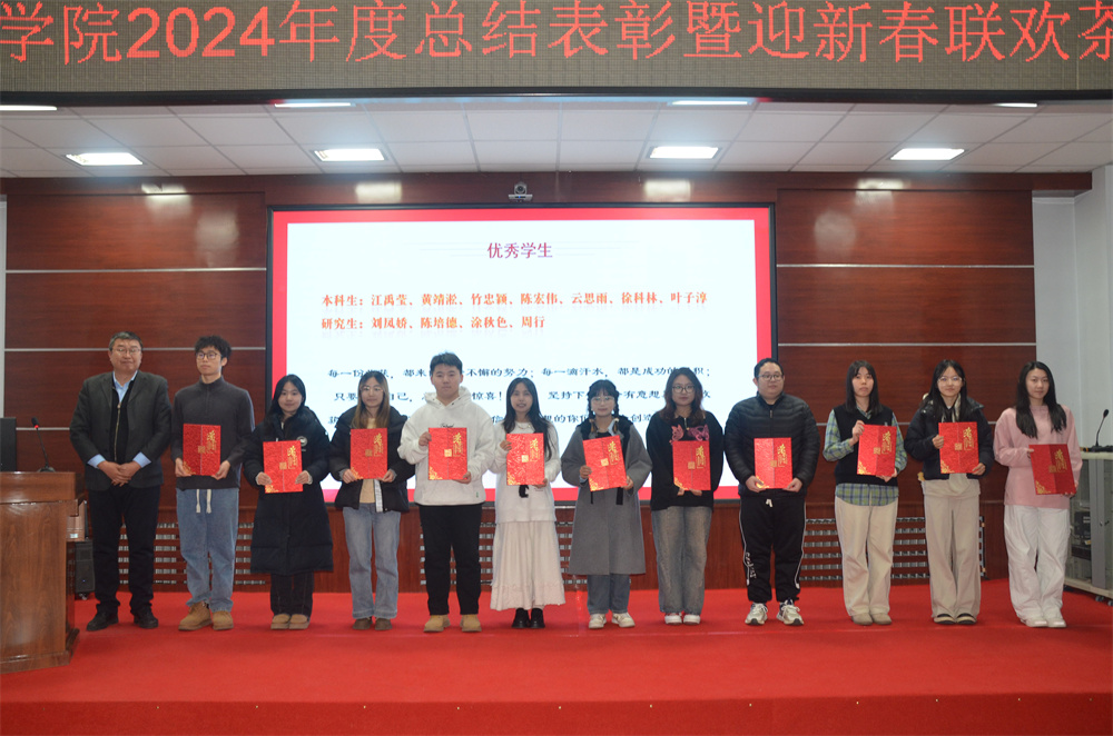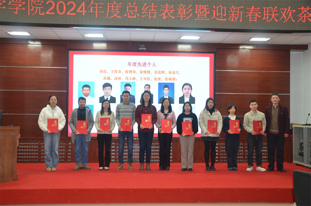 随后进入颁奖环节,主持人胡进平和贾子一宣读获奖团队、个人名单和颁奖词,学院领导分别为获得2024年度学院先进个人、先进单位、优秀学生、教书育人、科研育人,管理服务育人贡献奖的团队和个人颁奖并合影留念。