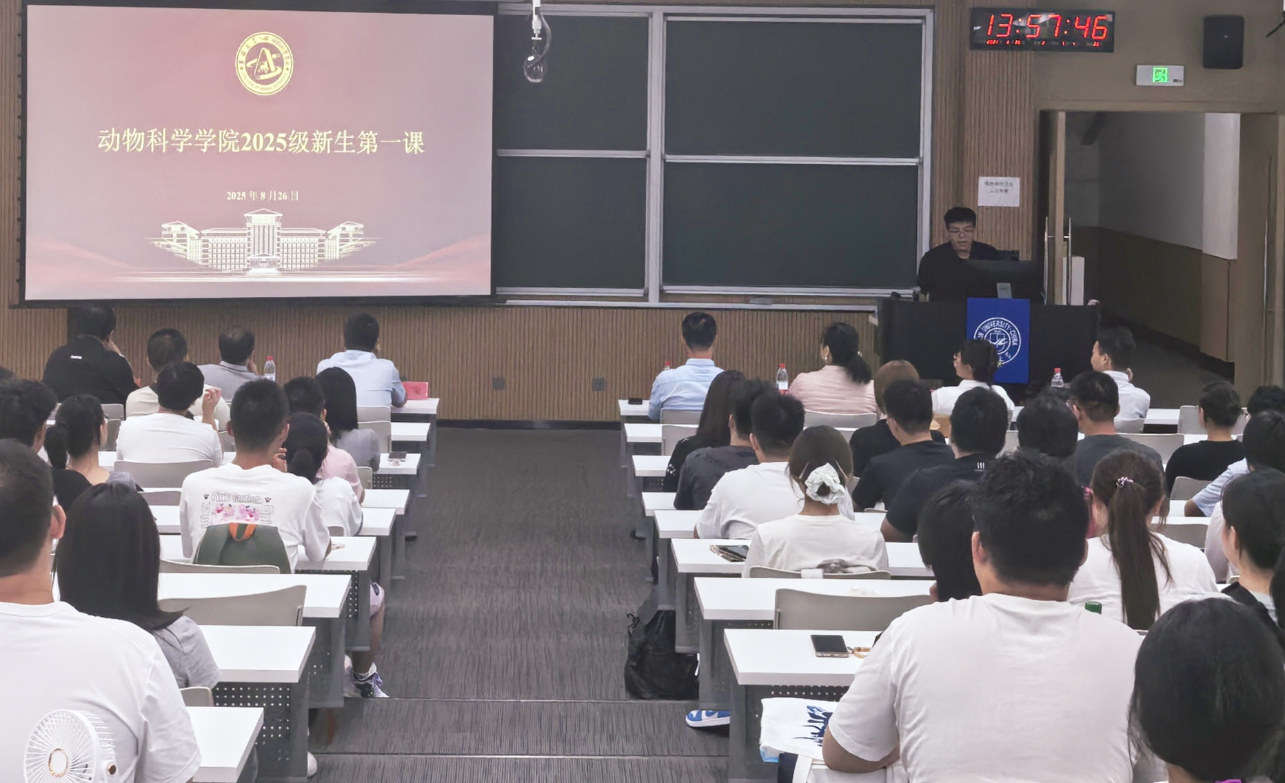院长孙博兴老师以“动物科学的殿堂”为题,开篇便抛出 “如何用科技破解‘人畜争粮’‘养殖污染’等行业难题” 的思考。他结合“楼房养猪”等快节奏、集约化、智能化养殖标杆案例,详细解读了立体养殖模式在土地集约利用、生物安全防控、环境精准调控等方面的技术优势 —— 通过温湿度自动控制系统维持猪舍恒定环境,利用物联网设备实时监测畜禽健康指标,借助粪污资源化利用技术实现 “养殖-种植”循环,让新生深刻理解“智慧教学”与“智慧牧业”的深度联动。“动物科学早已不是传统认知中的‘养猪喂牛’,而是融合了生命科学、信息技术、工程技术的交叉学科,”孙博兴院长强调,“希望同学们既能扎根专业理论学习,也能关注产业一线需求,成长为懂技术、善创新、能落地的复合型人才。”