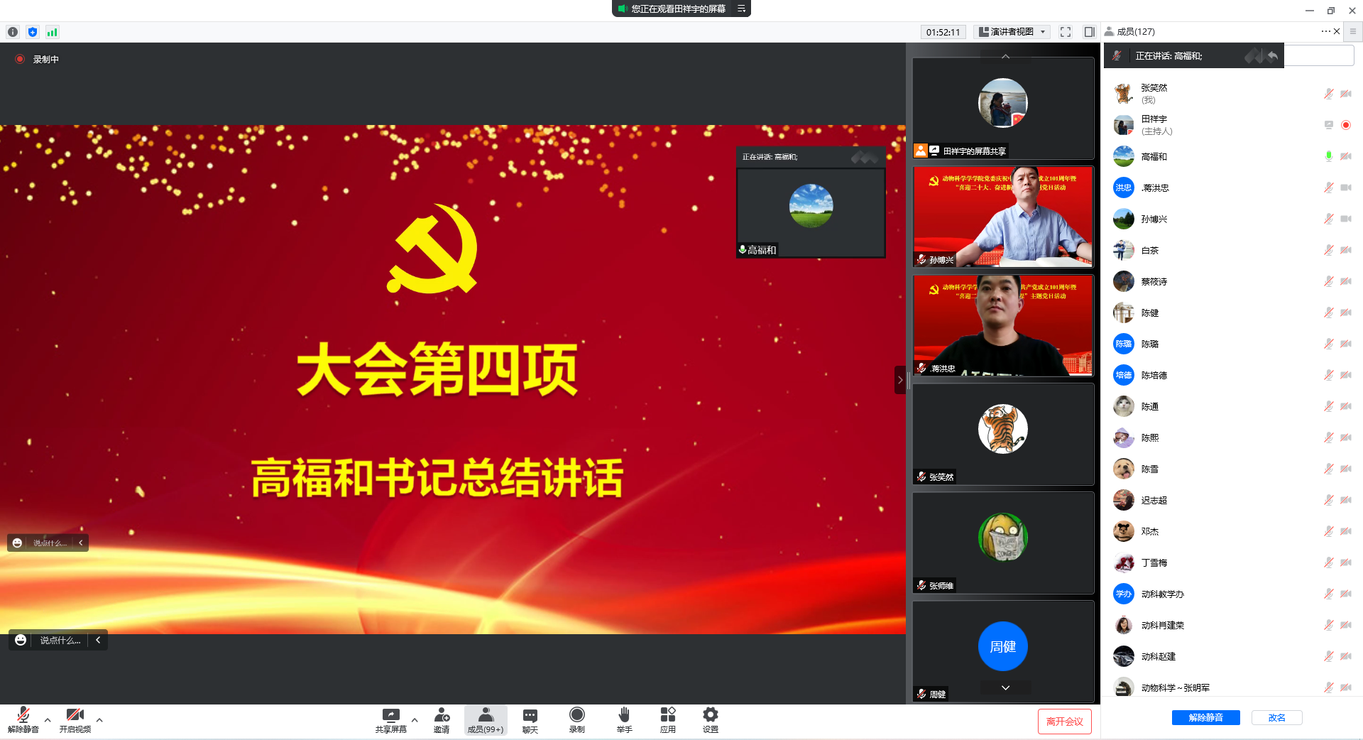 最后,党委书记高福和同志发表总结讲话。他分别用“累”、“守护”、“能”和“苦”评价了4位党课主讲人,同时,他也代表学院党委向4位坚守一线的党员和学院广大志愿者们表示了感谢和敬意。他号召全体师生向他们学习,一是要学习他们越是艰险越向前的忘我精神;二是学习他们召之即来来之能战的无畏精神;三是要学习他们坚守忍耐,默默奉献的无私精神;四是要学习他们听从组织召唤的大局意识。高书记强调,全体师生要将今天的感动化为今后工作的不竭动力,持续弘扬伟大的抗疫精神,让党旗永远飘扬在学院教学科研和人才培养的第一线,充分发挥党员先锋模范作用,助力学院建设与发展,以更加优异的成绩,向我们党的二十大胜利召开献礼。