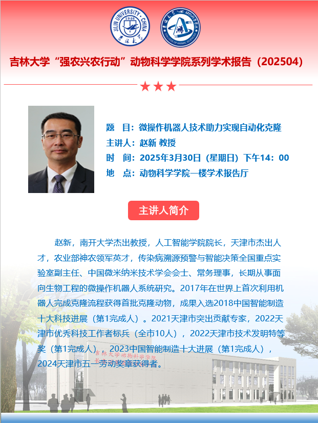 赵新,南开大学杰出教授,人工智能学院院长,天津市杰出人才,农业部神农领军英才,传染病溯源预警与智能决策全国重点实验室副主任、中国微米纳米技术学会会士、常务理事,长期从事面向生物工程的微操作机器人系统研究。2017年在世界上首次利用机器人完成克隆流程获得首批克隆动物,成果入选2018中国智能制造十大科技进展(第1完成人)。2021天津市突出贡献专家,2022天津市优秀科技工作者标兵(全市10人),2022天津市技术发明特等奖(第1完成人),2023中国智能制造十大进展(第1完成人),2024天津市五一劳动奖章获得者。