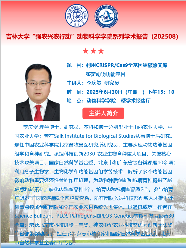 李庆贺 理学博士,研究员。本科和博士分别毕业于山西农业大学、中国农业大学;曾在Salk Institute for Biological Studies从事博士后研究。现任中国农业科学院北京畜牧兽医研究所研究员,主要从事动物功能基因组学和育种研究;承担科技创新2030-农业生物育种重大项目、关键核心技术攻关项目、国家自然科学基金委、北京市和广东省等各类课题10余项;利用分子生物学、生物化学和功能基因组学等技术,解析了多个功能基因影响动物重要经济性状的作用机理,为动物种质创新和抗病育种提供了新靶点和新素材。转化肉鸡新品种1个,培育肉鸡抗病新品系2个,参与培育广明2号白羽肉鸡等2个肉鸡配套系。所在团队入选科技部创新人才推进计划重点领域创新团队和全国农业农村系统先进集体。以通讯或第一作者在Science Bulletin、PLOS Pathogens和PLOS Genetics等期刊发表论著30余篇;荣获北京市科技进步一等奖、神农中华农业科技奖优秀创新团队奖等省部级奖励2项;担任多本杂志审稿专家和国家自然科学基金委、北京市自然科学基金委评审专家。