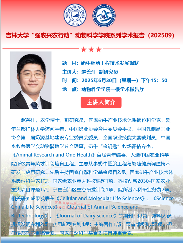 赵善江,农学博士,副研究员。国家奶牛产业技术体系岗位科学家,爱尔兰都柏林大学访问学者,中国奶业协会育种委员会委员,中国乳制品工业协会第二届奶源基地建设专业委员会委员,全国职业技能大赛裁判员,中国畜牧兽医学会动物繁殖学分会理事,奶牛金钥匙牧场评估专家,《Animal Research and One Health》首届青年编委,入选中国农业科学院所级青年英才计划培育工程。主要从事奶牛胚胎工程与繁殖健康调控技术研发与应用研究,先后主持国家自然科学基金项目2项、国家奶牛产业技术体系岗位科学家1项,国家级农业重大科技课题1项、科技创新2030-国家农业重大项目课题1项,宁夏自治区重点研发计划1项,院所基本科研业务费2项,参与省部级以上科研项目6项。相关研究成果发表在《Cellular and Molecular Life Sciences》、《Science China Life Sciences》、《Journal of Animal Science and Biotechnology》、《Journal of Dairy science》等期刊;以第一发明人授权发明专利2项,实用新型专利4项;以第2完成人制订国家标准1项;主编著作1部,获省部级奖项2项,担任多部杂志审稿专家、国家自然科学基金委项目评审专家。