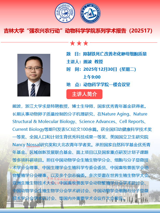 熊波,浙江大学求是特聘教授、博士生导师,国家优秀青年基金获得者。长期从事动物卵子质量控制的分子机理研究,在Nature Aging、Nature Structural & Molecular Biology、Science Advances、Cell Reports、Current Biology等期刊发表SCI论文100余篇。获全国妇幼健康科学技术奖一等奖、全国人口和计划生育优秀科技成果一等奖、美国国立卫生研究院Nancy Nossal研究奖和大北农青年学者奖。承担国家自然科学基金优秀青年基金、区域创新发展联合基金、面上项目以及国家重点研发计划子课题等多项科研项目。担任中国动物学会生殖生物学分会、细胞与分子显微技术学分会理事、中国生理学会生殖科学专委会委员、中国畜牧兽医学会动物繁殖学分会理事,以及多个杂志编委。多次受邀在世界生殖生物学大会、亚洲生殖生物技术大会、中国畜牧兽医学会动物繁殖学分会学术研讨会、中国动物学会生殖生物学分会学术研讨会、中国动物学会细胞与分子显微技术学分会学术研讨会、等国内外重要学术会议作大会报告。