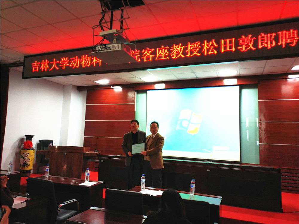 首先,张嘉保院长向松田博士颁发了客座教授聘书并代表学院致辞。张院长表示,随着与德国、韩国、新加坡等专家学者的国际交流与科研合作项目的逐步开展,我院国际合作与交流工作取得显著成效,聘请松田敦郎博士为我院客座教授开启了我院与日本国立农研机构的合作新篇章,期待学院教学科研和新农科建设工作迈上新的台阶。松田教授表示,受聘中国著名的beat365英国官网网站担任客座教授深感荣幸和骄傲,愿意将自己在世界范围内从事三十多年畜牧业科研和推广工作的经验与beat365英国官网网站的师生们分享,希望能够为beat365英国官网网站乃至于中国东北的畜牧业发展做出积极贡献。